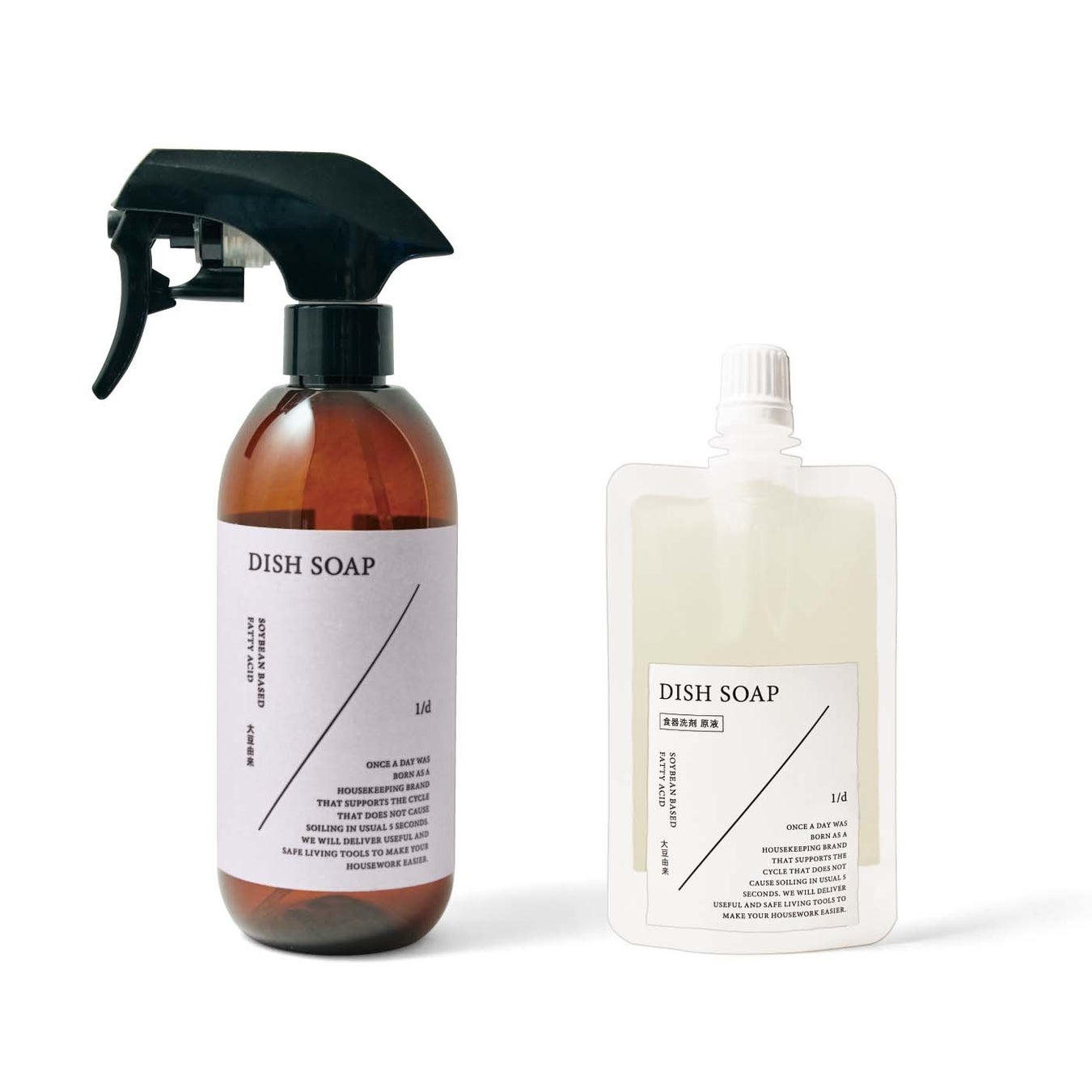 霧吹きのように食器に吹きかける、スプレー形の食器用洗剤です。泡がないため、すすぎが簡単で、水も時間も節約できます。界面活性作用のある大豆脂肪酸のナノ粒子が、お皿の汚れを包み込んで分解してくれます。キッチンにもなじむスタイリッシュなボトルは、バイオマス素材を使用しています。洗剤原液のパウチは水で薄めて使う濃縮タイプで、パウチがコンパクトなので、ゴミの軽量化も実現しています。
