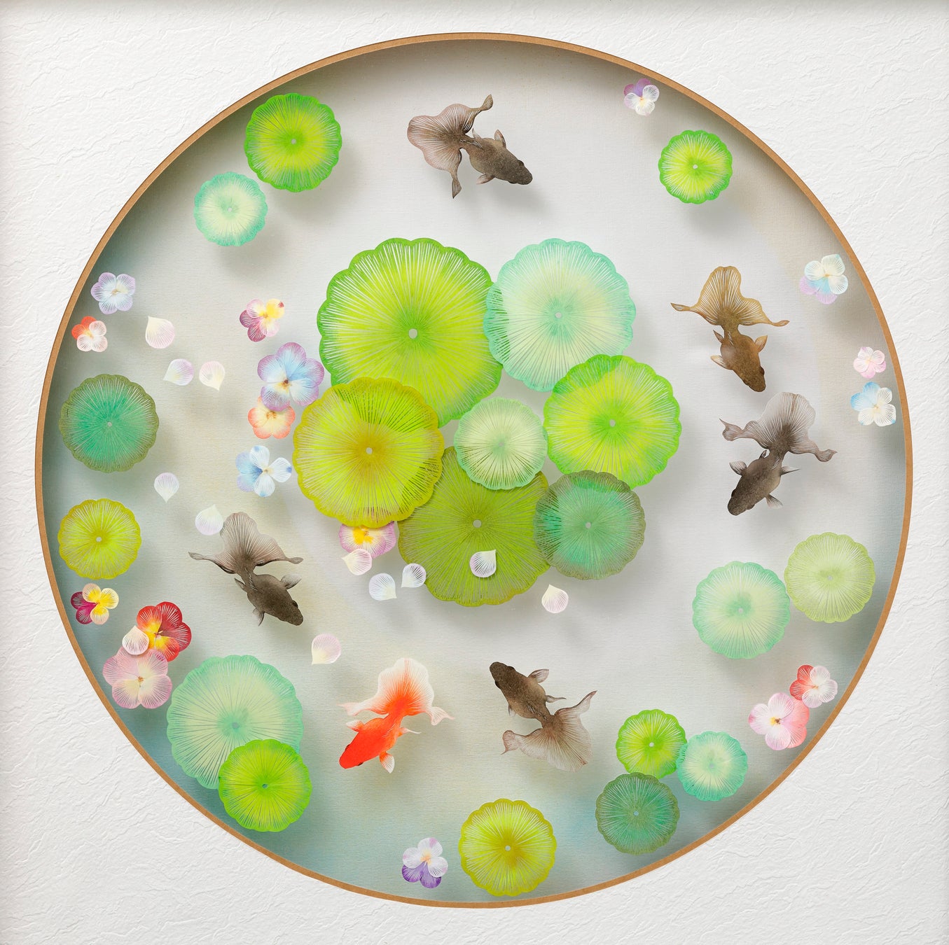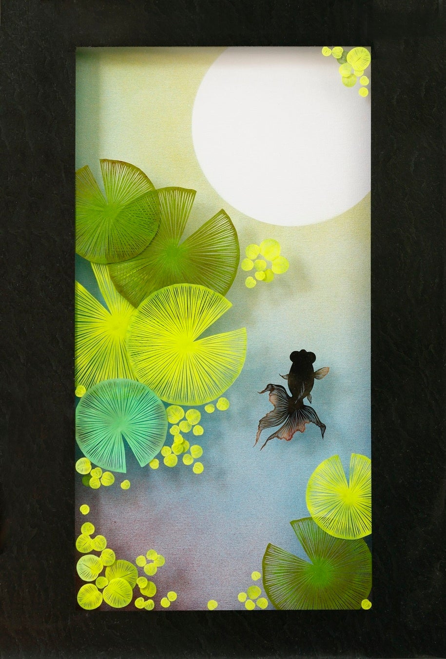 色とりどりの切り絵と、それが創り出す影の世界。水の上に咲く花、水面の植物、水中を優雅に泳ぐ可憐な金魚たちの姿をお楽しみください。