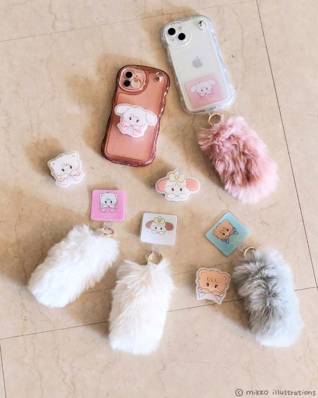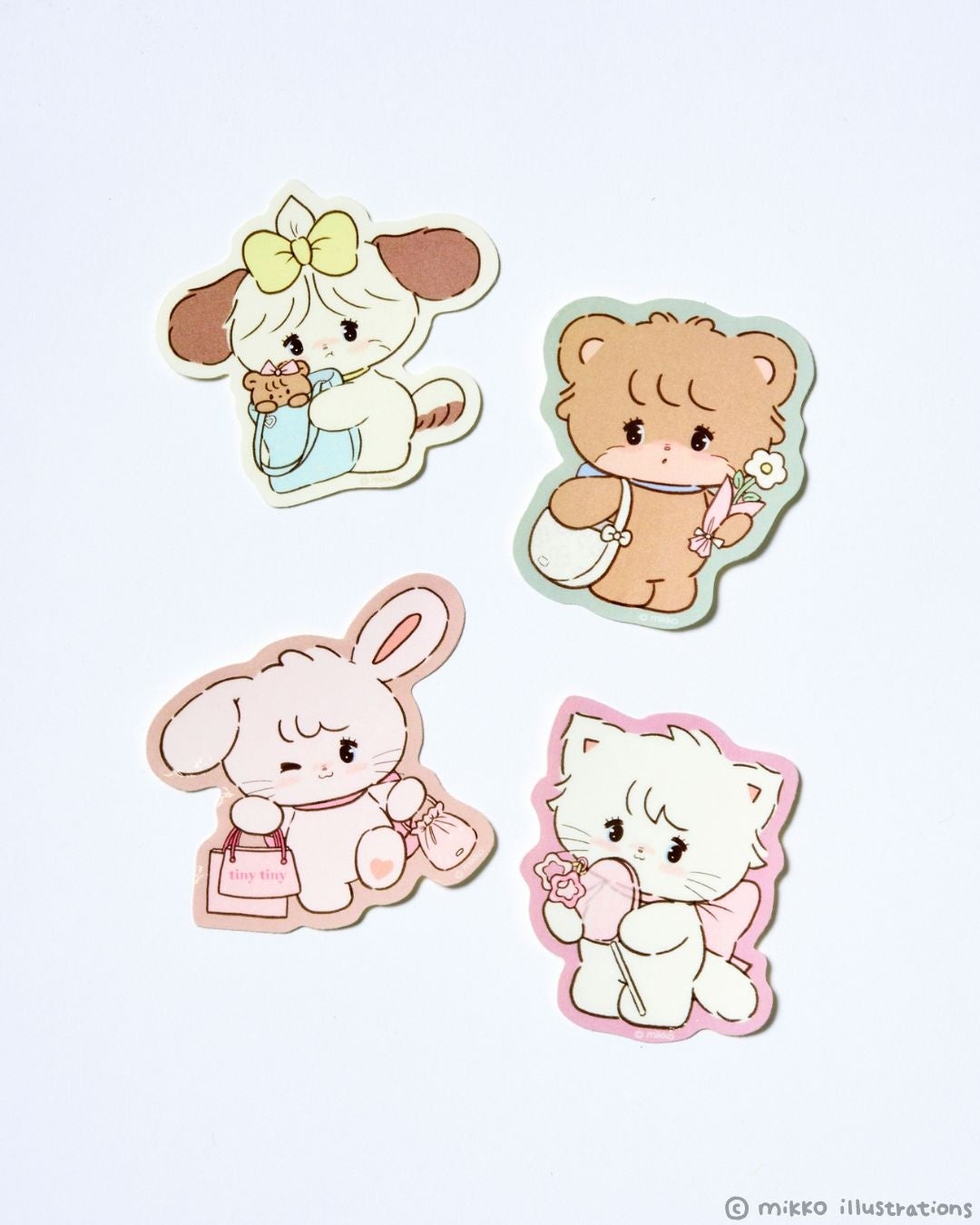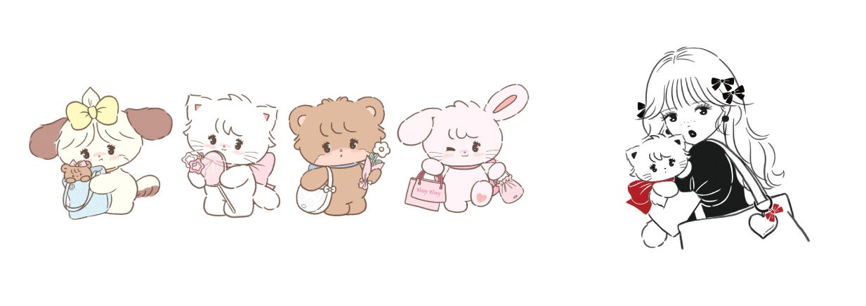 mikkoの描く「mikko characters」のムース、キャミー、スフレ、ラテと女の子が「tiny tiny」のアイテムを身に着けている、コラボ限定の特別なグラフィックとなっています。