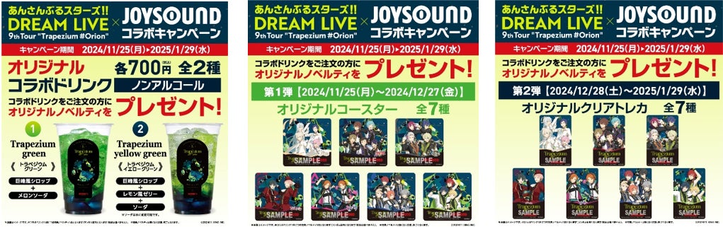 全国の対象カラオケ店舗では、「あんさんぶるスターズ!!DREAM LIVE -9th Tour “Trapezium #Orion-」をイメージしたオリジナルコラボドリンク(全2種)を展開!第1弾[11月25日(月)~12月27日(金)]の期間中はオリジナルコースター(全7種)、第2弾[12月28日(土)~1月29日(水)]の期間中はオリジナルクリアトレカ(全7種)を、1点のご注文につき1枚、特典としてプレゼントします。