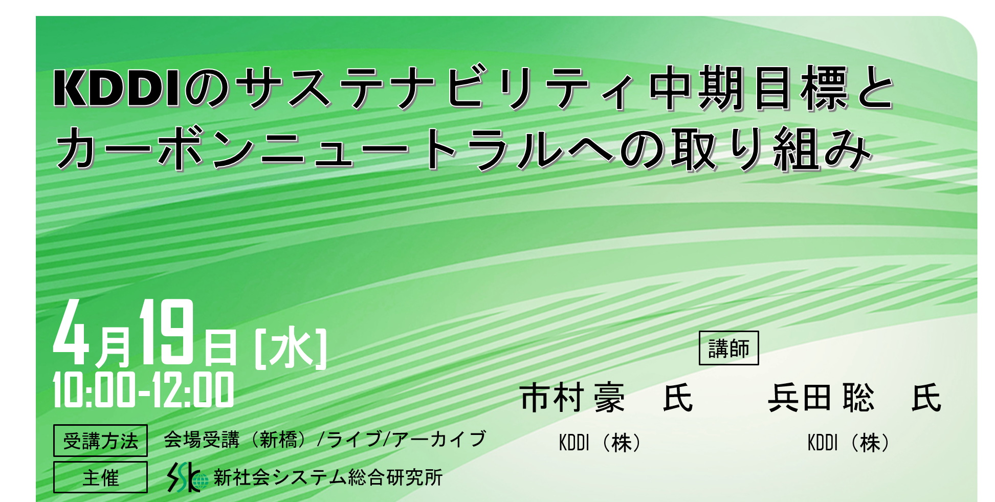 「KDDIのカーボンニュートラルへの取り組み」と題して、KDDI(株)市村 豪氏、兵田 聡氏によるセミナーを2023年4月19日(水)に開催!!