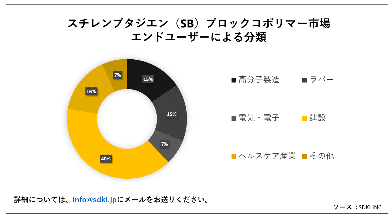 エンドユーザーに基づいて、建設セグメントは予測期間までにスチレンブタジエン(SB)ブロックコポリマー市場の収益で大きなシェアを占めると予想されます。このセグメントの成長の主な理由は、ジョイントフィラー、シーラント、アスファルト添加剤などの建設用途でSBブロックコポリマーの需要が増加していることに起因しています。2021年には、2020年と比較して13%の建設プロジェクト数の増加が確認されています。米国では、毎年150万戸の新しい住宅が計画されています。このような建設プロジェクトの需要増加に伴い、優れた特性を持つ材料への需要も増加しています。SBブロックコポリマーは、高い機械的強度、優れた接着性、優れた熱安定性などの優れた特性を有し、建設に最適な材料です。
