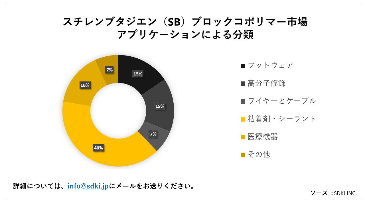 自動車業界や消費財業界からのSBブロックコポリマーに対する需要の増加が、スチレンブタジエン(SB)ブロックコポリマー市場の成長を導く主要因となっています。履物やスポーツシューズなどの消費財の売上が急速に伸びています。米国では、靴の生産者、小売業者、流通業者に経済の50%以上が寄与しています。2019年、靴産業は米国で一人当たり平均276USDを生み出した。2018年、米国では店舗での靴の販売により340億米ドルの収益が得られました。靴メーカーは、耐久性、柔軟性、耐摩耗性などの優れた特性により、製品の生産にSBブロックコポリマーを使用することが増えています。さらに、SBブロックコポリマーは靴底、ミッドソール、アッパーパーツの