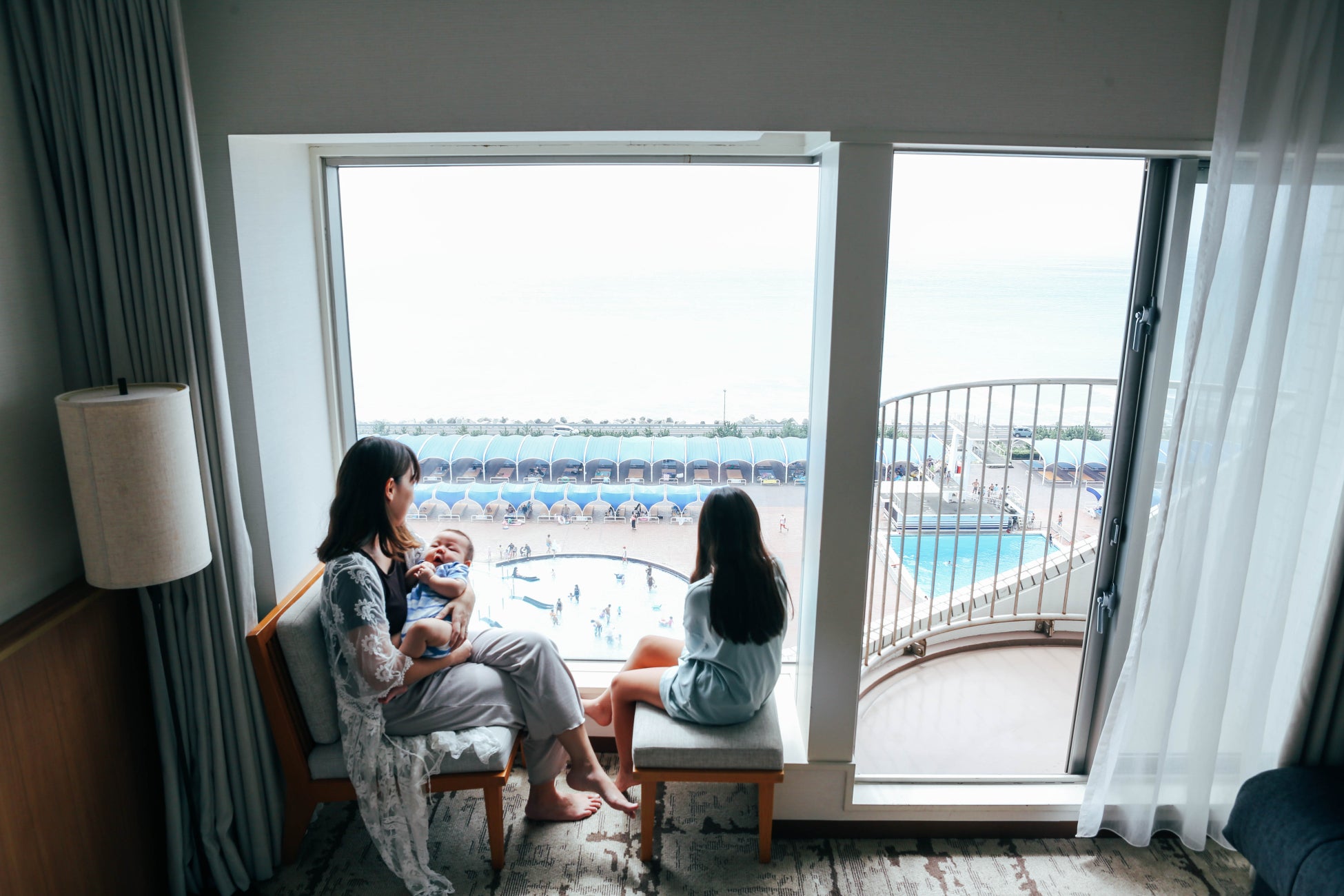 ⑤ プール利用前にチェックインし、夕飯までお部屋で一休みや小さなお子さまのお昼寝も叶う