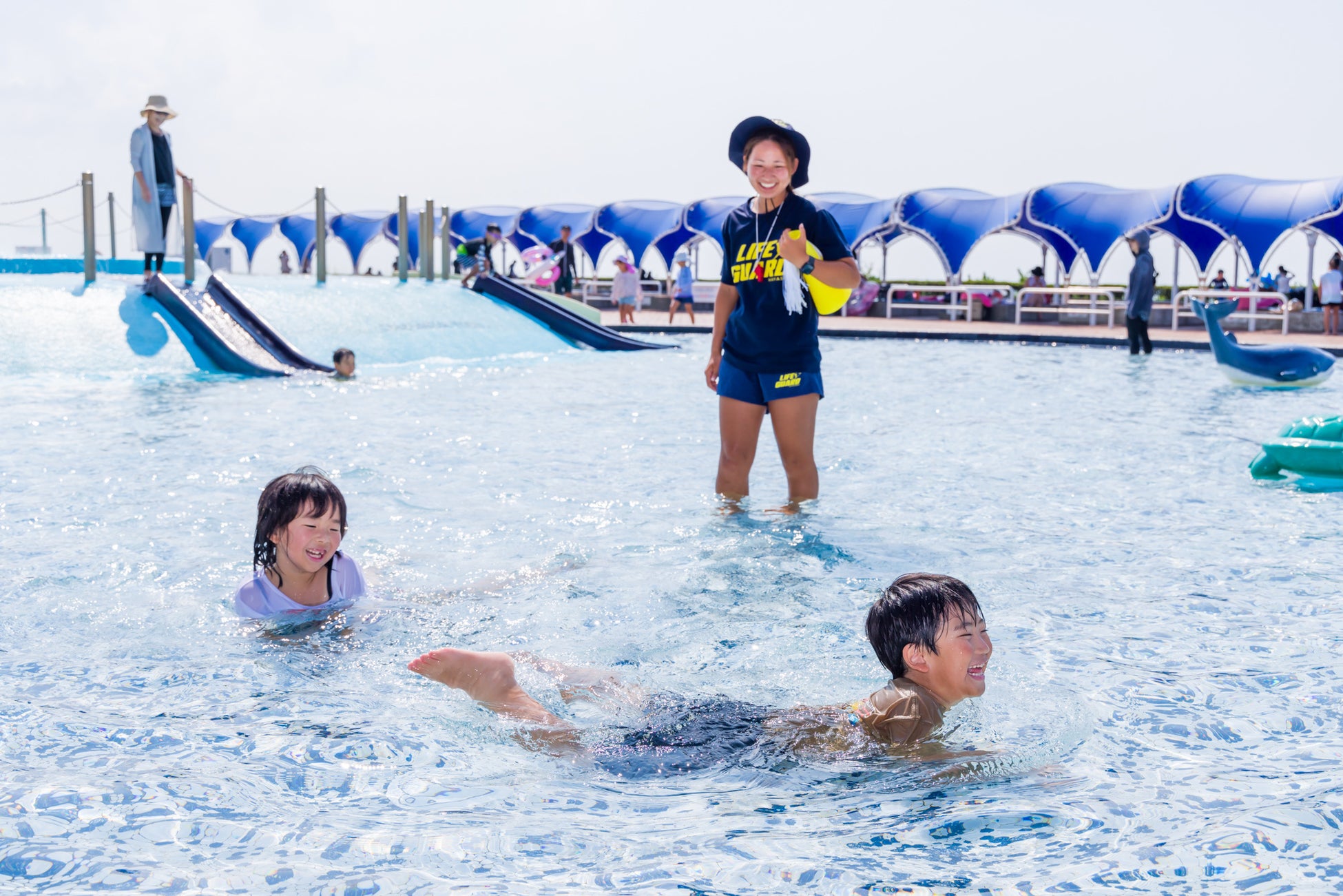 ② ライフガードの細やかな監視で安心してプール遊びができる