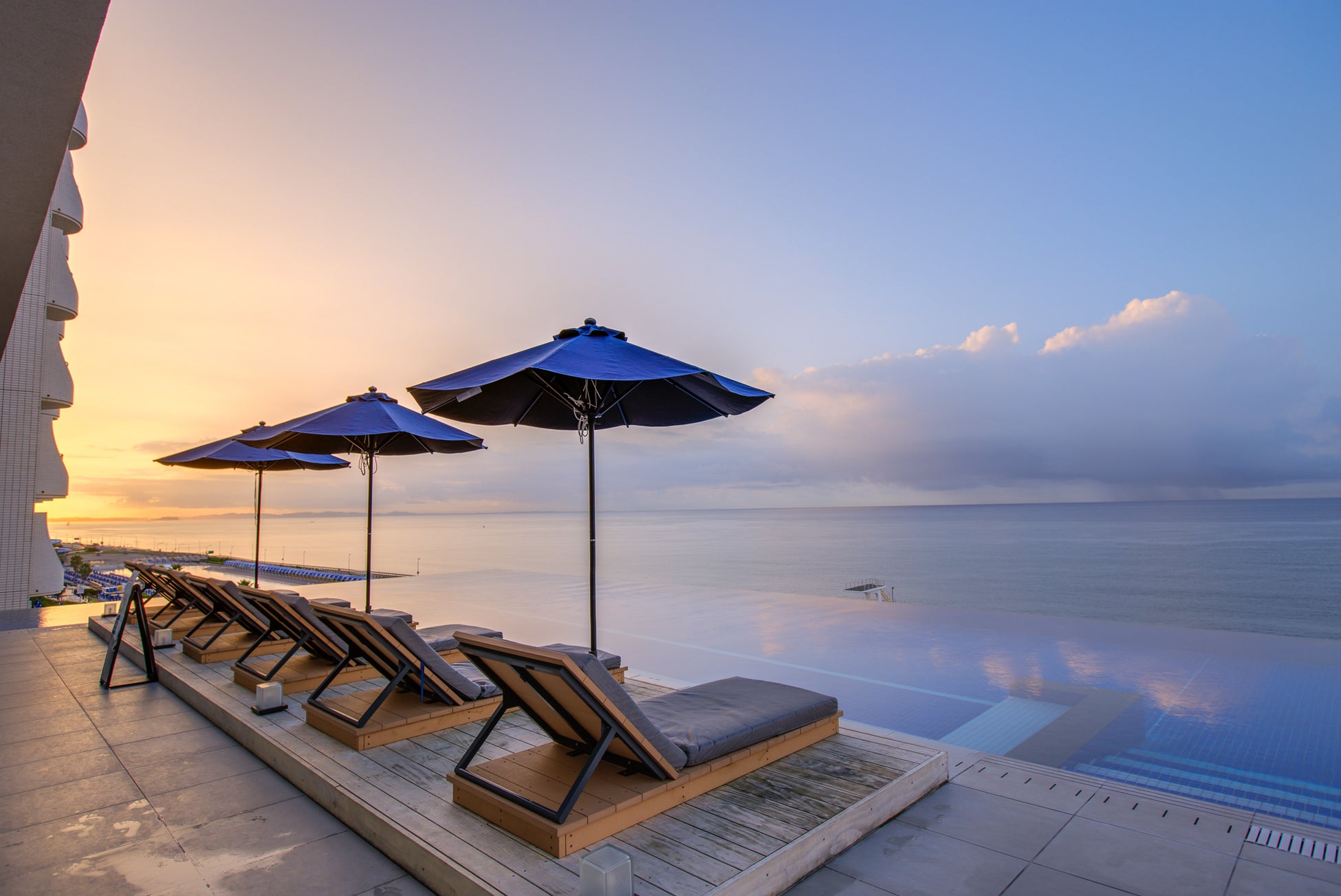 都心から約1時間で行ける気軽さが魅力の、空と海が広がるカジュアルリゾート。解放感抜群のロケーションと、モダンでボーダーレスな空間で、絶景に包みこまれる深い癒やし体験を得られます。