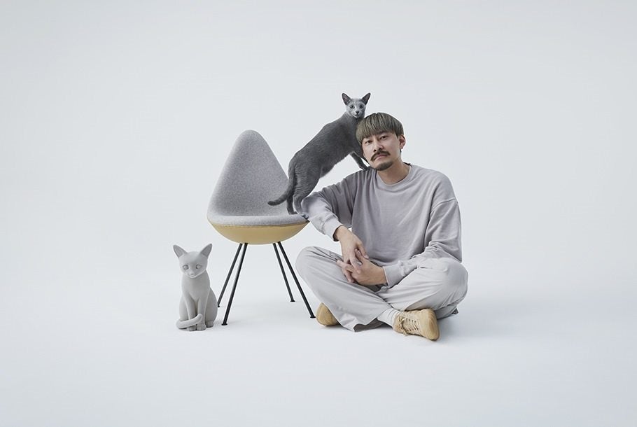 1983年に岡山県に生まれ、現在は東京を拠点に活動。今回の<フリッツ・ハンセン>とのコラボレーションでは、このブランドのファンがもっているイメージを大切に考えながら、自身のエッセンスを加えるような感覚で制作に臨んだそうです。モチーフに選んだのは、約1年前から自宅で飼っているロシアンブルーの「もろこし」。橋爪さんの近作にもよく登場している猫で、椅子のシートに丸くなって座るのがとても好きなのだとか。アルネ・ヤコブセンの「ドロップチェア」の上に猫のオブジェを載せたのは、オリジナルの完成度を尊重したからでもあるそうです。
