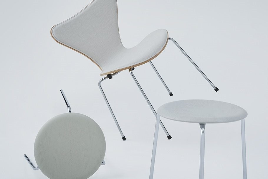 デザイナーの岩井 良太さんは1983年生まれ。以前から<フリッツ・ハンセン>に憧れがあったという岩井さんは、<オーラリー>のレディースの洋服のために開発したテキスタイルを「セブンチェア」の張り地として使用。また絶妙のベージュとグレーを用いた2種類の「ドットスツール」も手がけています。1脚ずつでも魅力的ですが、3脚揃った色彩のバランスにはいっそうの<オーラリー>らしさがあります。