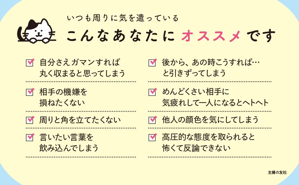 優しい気遣いさんは、できるだけ人間関係を穏便にしたいと考えるため「私さえガマンすれば丸く収まる」と相手に合わせている傾向があります。ハラスメントや嫌がらせ、キツイ言葉を言われても本来の自分を抑え込んで言い返すことができず、気疲れでヘトヘトになってしまっている。そんな方々の心に寄り添った一冊になっています。