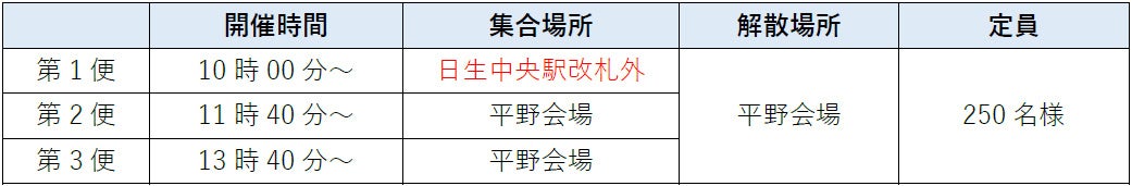 ※会場内混雑緩和のため第1便目は「日生中央駅」が集合場所となります。