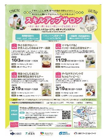 スキルアップサロンは、子育て・仕事・家事など、様々な活動を頑張る女性をターゲットに、復職後の働き方の工夫や家事育児の棚卸しなど、女性のスキルアップに役立つセミナーと料理教室をセットで実施する、参加者が楽しく学んで交流できるイベントです。