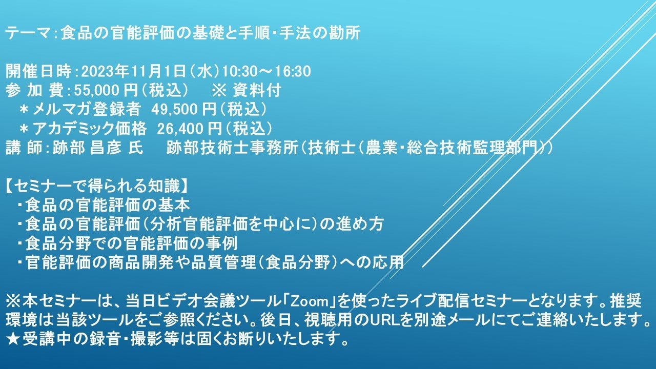 【ライブ配信セミナー】食品の官能評価の基礎と手順・手法の勘所 11月1日(水)開催 主催:(株)シーエムシー・リサーチ