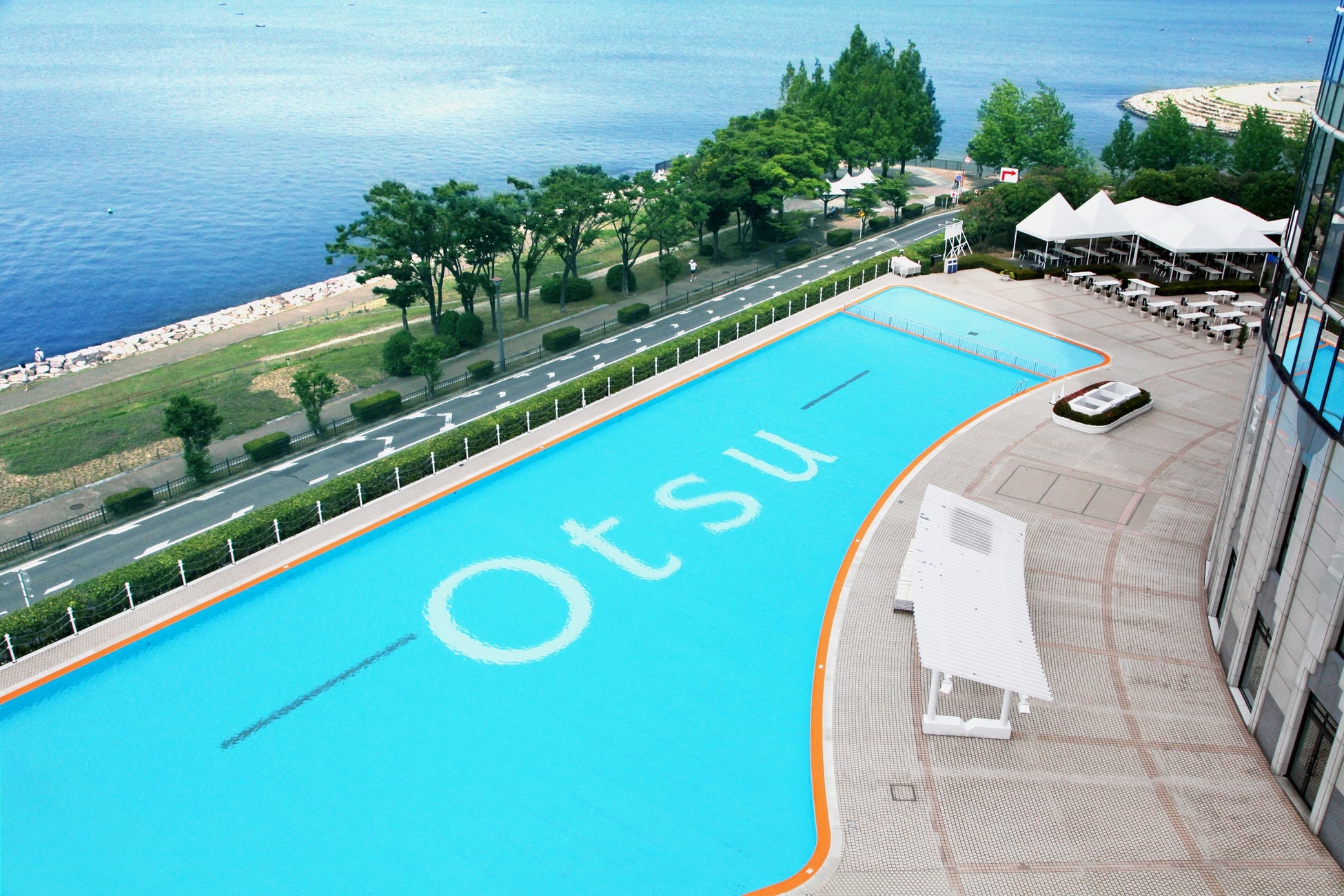 びわ湖の形を模したプールは全長90m、最大幅23mのスケール。
