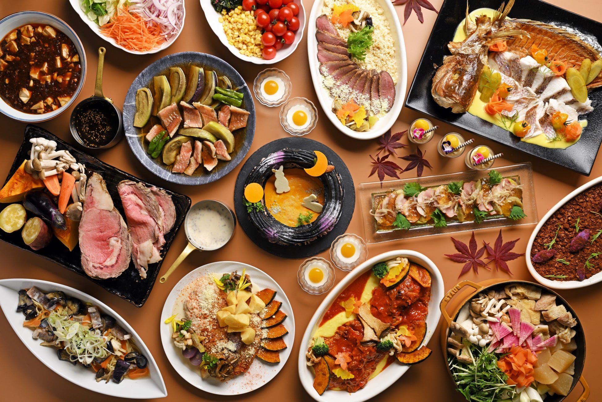 鴨スモークと焼きナス 柚子胡椒風味の出汁ジュレ添え/低温で柔らかく仕上げた国産牛のロースト 茸デュクセル入りクリームソース/近江鶏のカチャトーラ風 秋野菜添え/白身魚のア・ラ・ヴァプール サフラン風味のナージュソース 秋の装い など