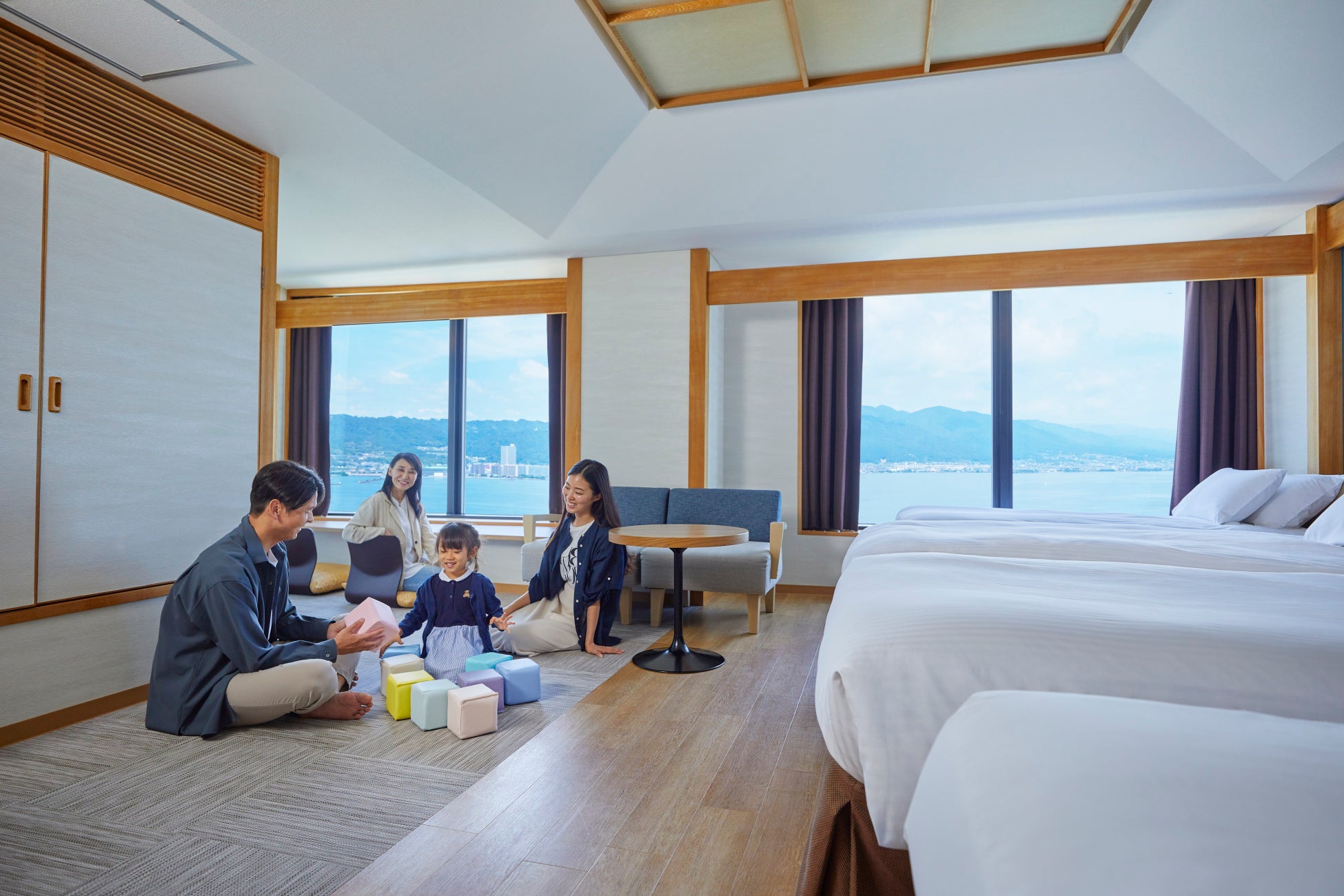 窓際にびわ湖の眺望がお楽しみいただけるリビングスペースを設け、より快適で上質なご滞在をお約束します。
