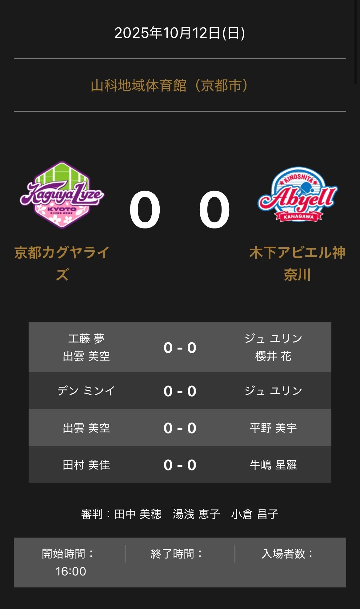 ノジマTリーグ 2025-2026シーズン 公式戦 10月12日開催 京都カグヤライズ vs 木下アビエル神奈川 対戦オーダー発表