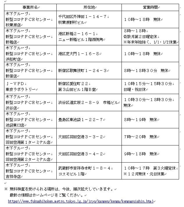 令和3年12月23日(木)時点で無料検査を受けられる場所