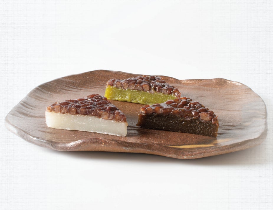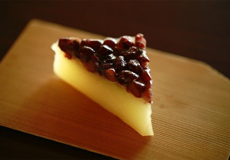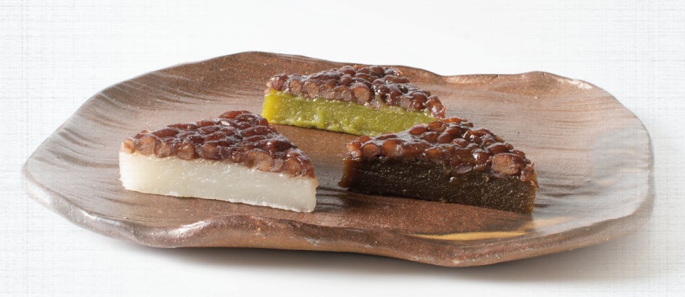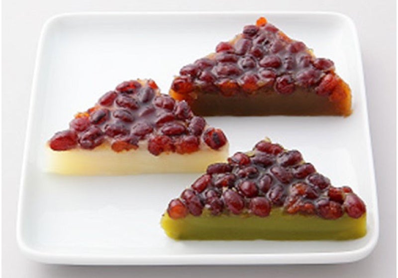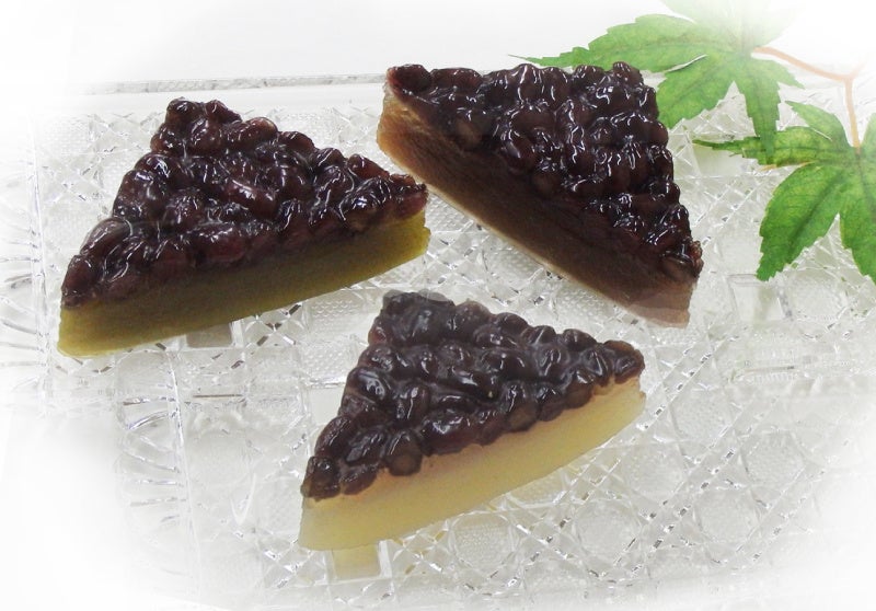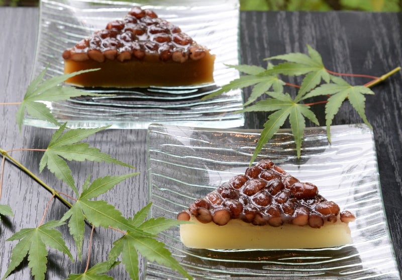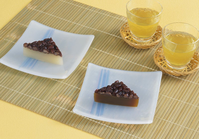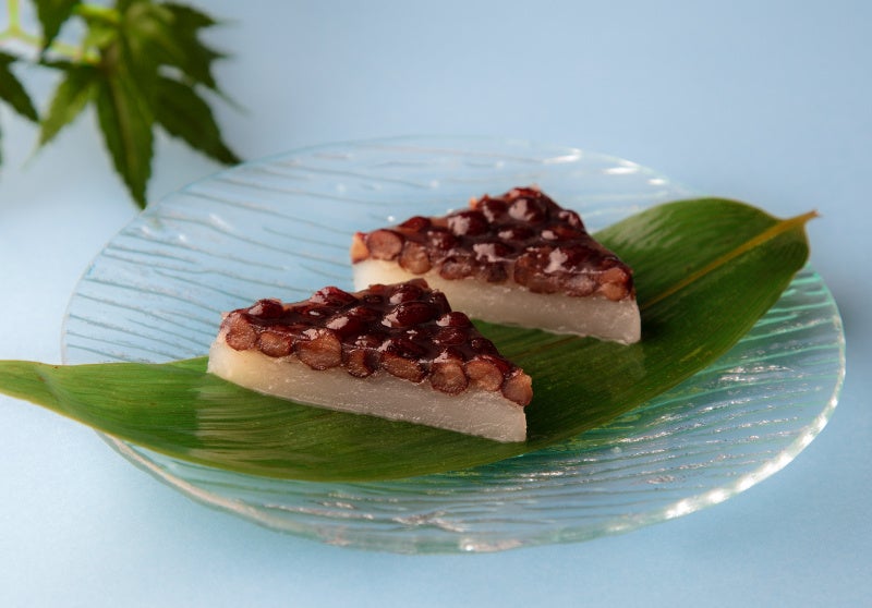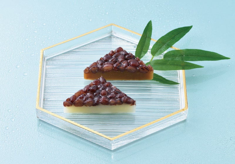 甘く煮た北海道産小豆をのせ、吉野本葛粉とわらび粉を使ってもっちりと仕上げた三角形のういろうです。