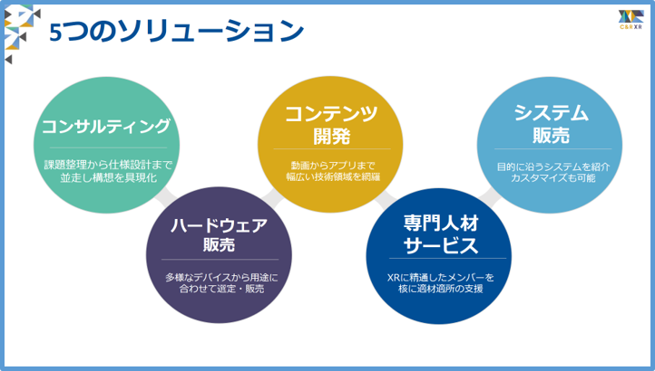 C&R社のXR事業は、独自開発したVR研修内製化システム「ファストVR」をはじめ、VR・AR・MRの コンテンツの制作や、プラットフォーム開発、ハードやソリューションをワンストップで提供するほか、「VR転職スカウト登録」を運営し、クリエイターやエンジニアのエージェントまでを手掛ける、XR分野で他に類を見ないサービスを展開しております。