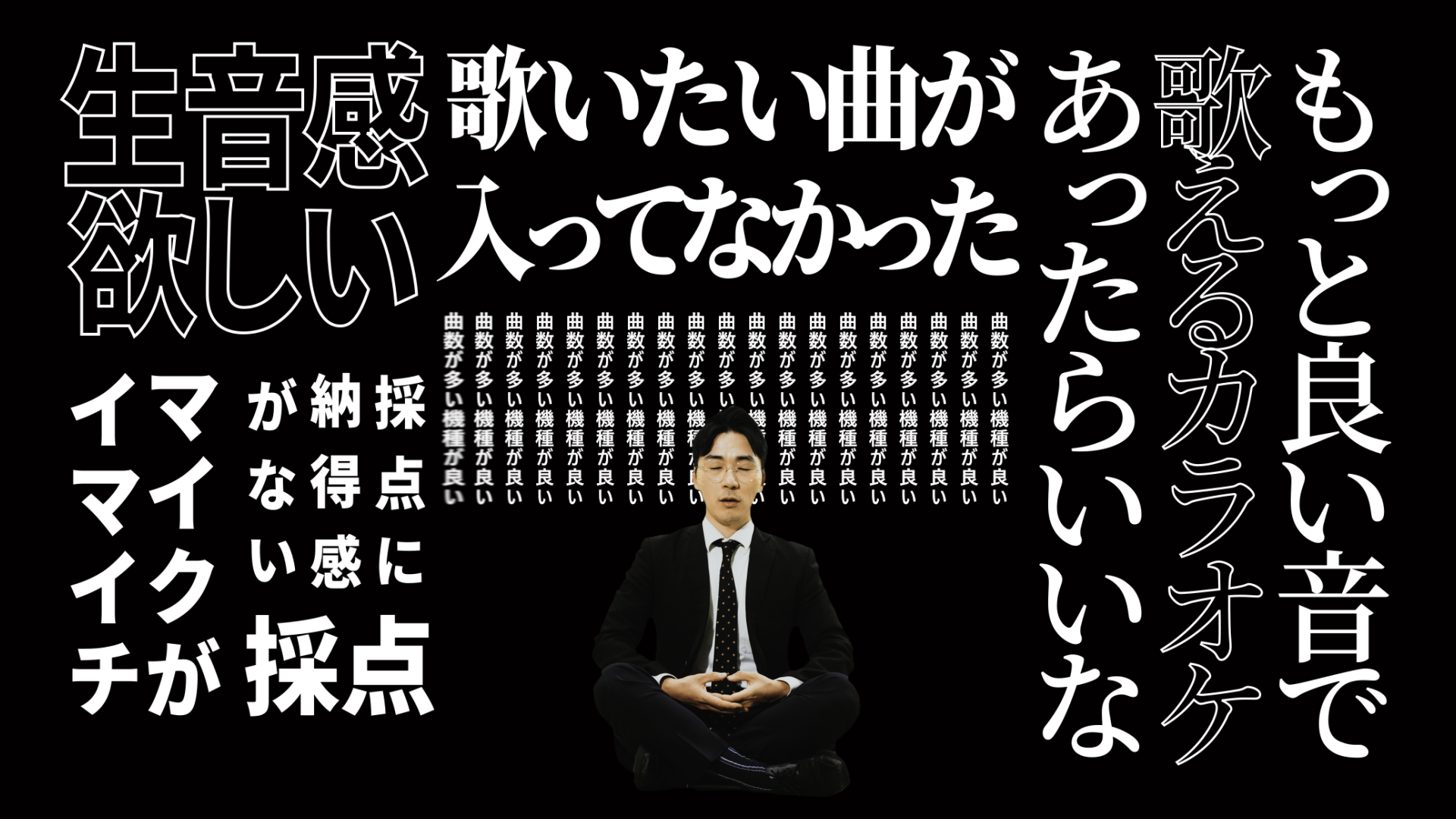 2022年にも、「みんなで歌うって楽しい」をテーマにJOYSOUNDのWEBCMを手掛けたDOTAMA氏。第二弾となる本作は「歌いやすさとは?」「最高のカラオケとは何か?」などと、カラオケでありがちな悩みの数々を問うシーンから幕を開けます。その悩みを打ち破るかのように再登場したDOTAMA氏が「だったらJOYSOUND X1で歌おうぜ」と叫ぶと、冒頭とは打って変わって、曲調もパワフルに変化!そして、「曲数No.1」(※1)をはじめ、AIによる採点や、音の良さ、歌いやすさなど「JOYSOUND X1」の魅力をハイテンションに歌い上げます。