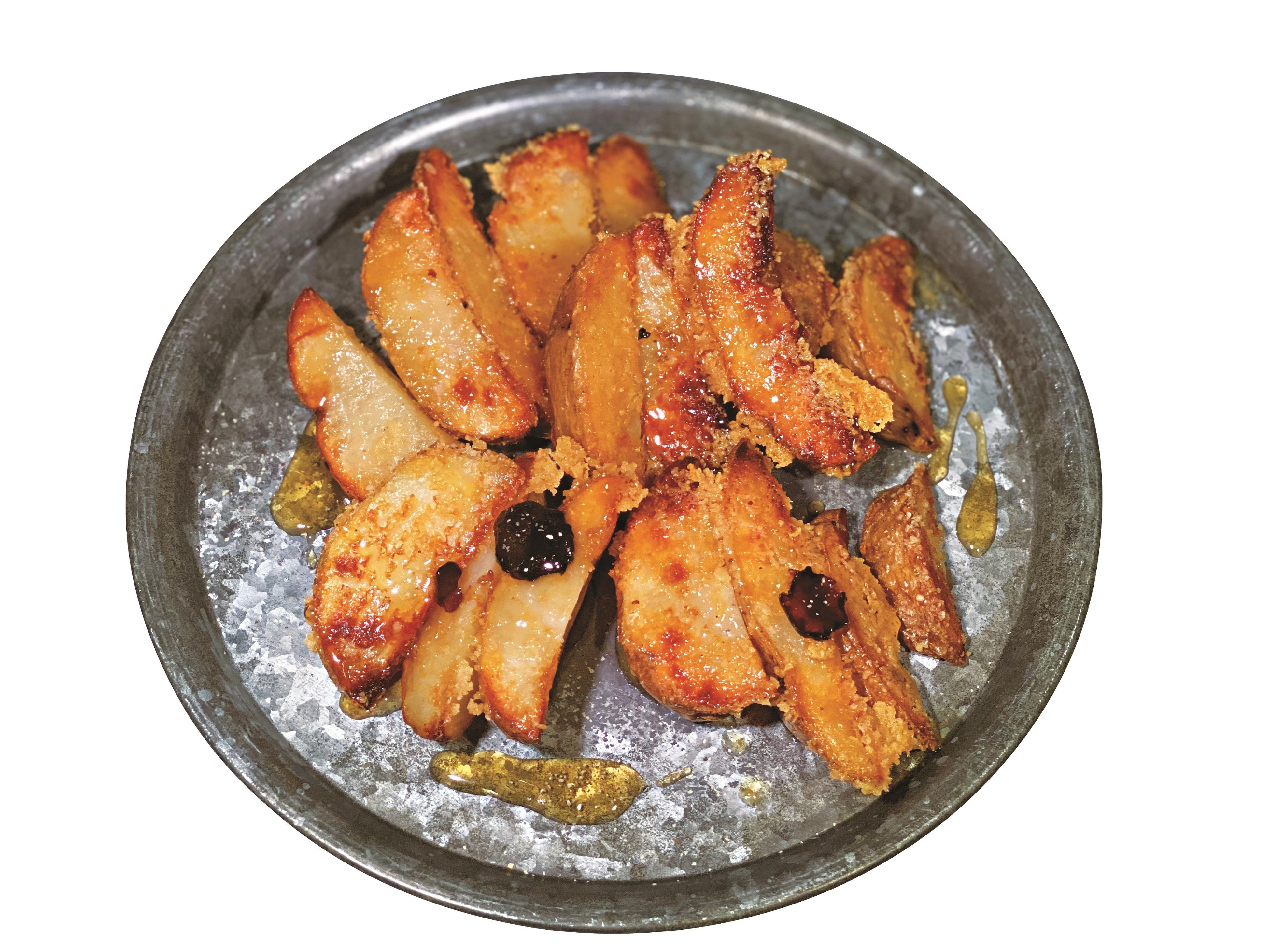 <サヴィーニ タルトゥーフィ>はヨーロッパで100年近く続くトリュフブランド。揚げずにパルメザンチーズとトリュフオイルで時間をかけてローストしたポテトは、香ばしく風味が豊か。カリッと焼き上がったポテトに、白トリュフはちみつをかけて完成。甘味と塩味のバランスが絶妙な一品。