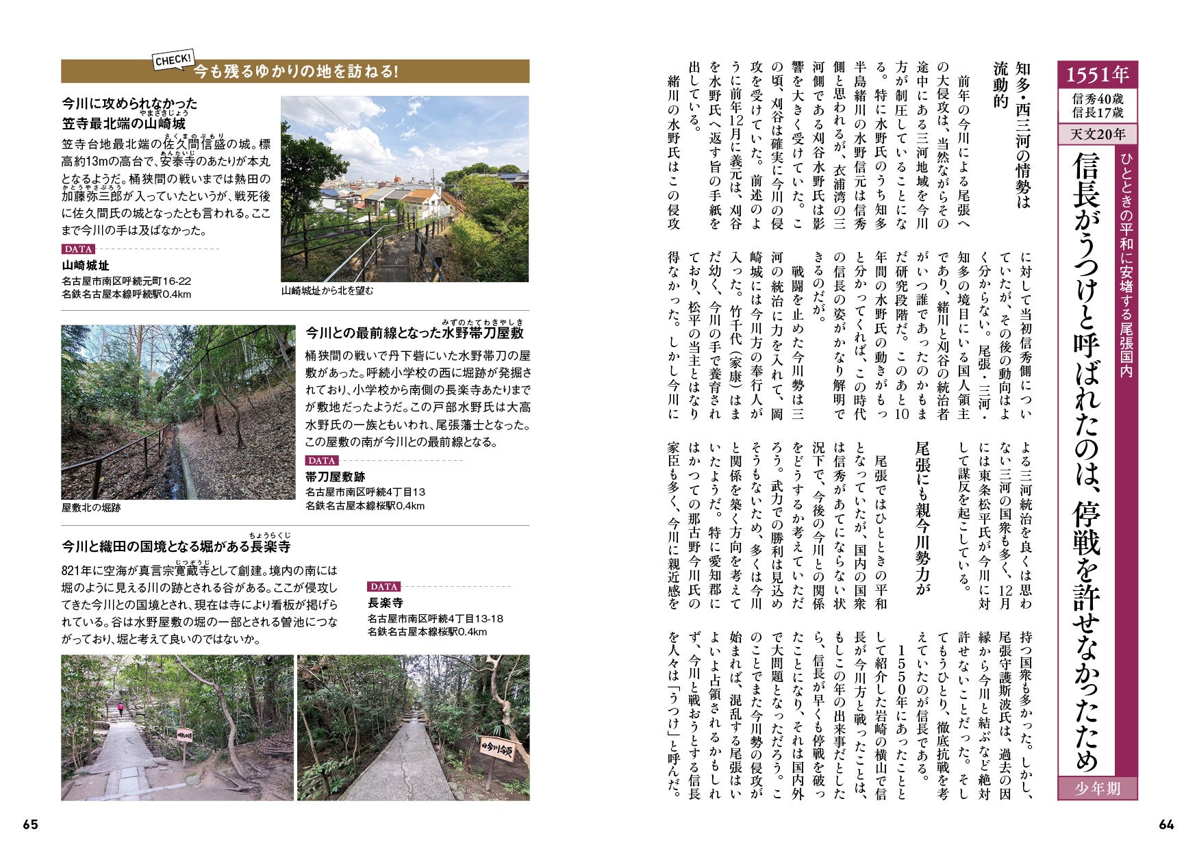 信長の足跡などを辿れる「ゆかりの地」のガイドも充実。本書片手にフールドワークに出かけて、若き信長の心情をリアルに感じられます。