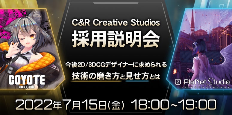 株式会社クリーク・アンド・リバー社(C&R社)は、7月15日(金)、「C&R Creative Studios」に属する「2DCG PlaNetStudio」と「COYOTE 3DCG STUDIO」の中途採用説明会を開催いたします。