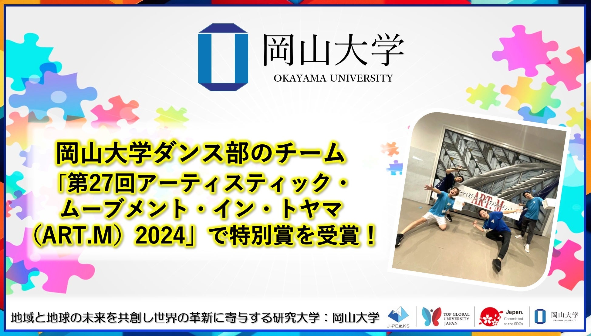 国立大学法人岡山大学(本部:岡山市北区、学長:那須保友)のダンス部のチーム「烈津男須」は、2024年9月15、16日に富山県(ふくおか総合文化ホール)で開催された「第27回アーティスティック・ムーブメント・イン・トヤマ(ART.M)2024」にて、上位10賞の一つである特別賞を受賞しました。