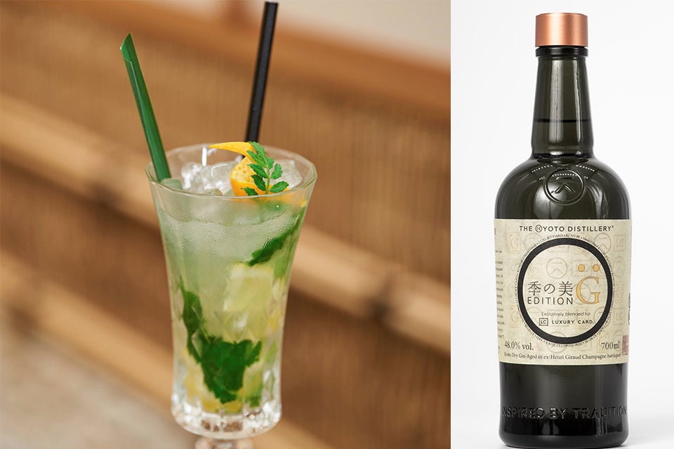 京都に創立され、過去に2度、英国の酒類品評会「IWSC」において最高賞を受賞しているジン専門「京都蒸溜所」と、2008年に米国で創業し、ミレニアル世代の新富裕層を中心に会員数が急増している金属製クレジットカード「ラグジュアリーカード」が共に5周年を迎えたことを記念して、「ラグジュアリーカード」のために特別にブレンドした「季の美 エディションG exclusively blended for LUXURY CARD」(※以下「季の美 エディションG exclusively blended for L.C.」)。フランスで1625年に創業し「幻のシャンパーニュ」とも呼ばれる老舗メゾン「アンリ・ジロー」から輸送したシャンパーニュ樽に、京都蒸溜所のフラッグシップ商品「季の美 京都ドライジン」を詰めてボトリングしたカスクエイジドジンで、2022年春にラグジュアリーカードオリジナルラベルとBOXで登場。同カード会員限定で先行販売されました。2019年に「季の美 エディションG」を限定発売した際は即完売し、再販を熱望するファンやコレクターの声を受けて再度製造されたこの入手困難な希少ジンをどなたでもお楽しみいただける「オリジナルカクテルセレクション」を、このたびタワーズバー「ベロビスト」にて期間限定でご用意いたします。東京都内では初の「季の美 エディションG exclusively blended for L.C.」カクテルプロモーション企画となります。