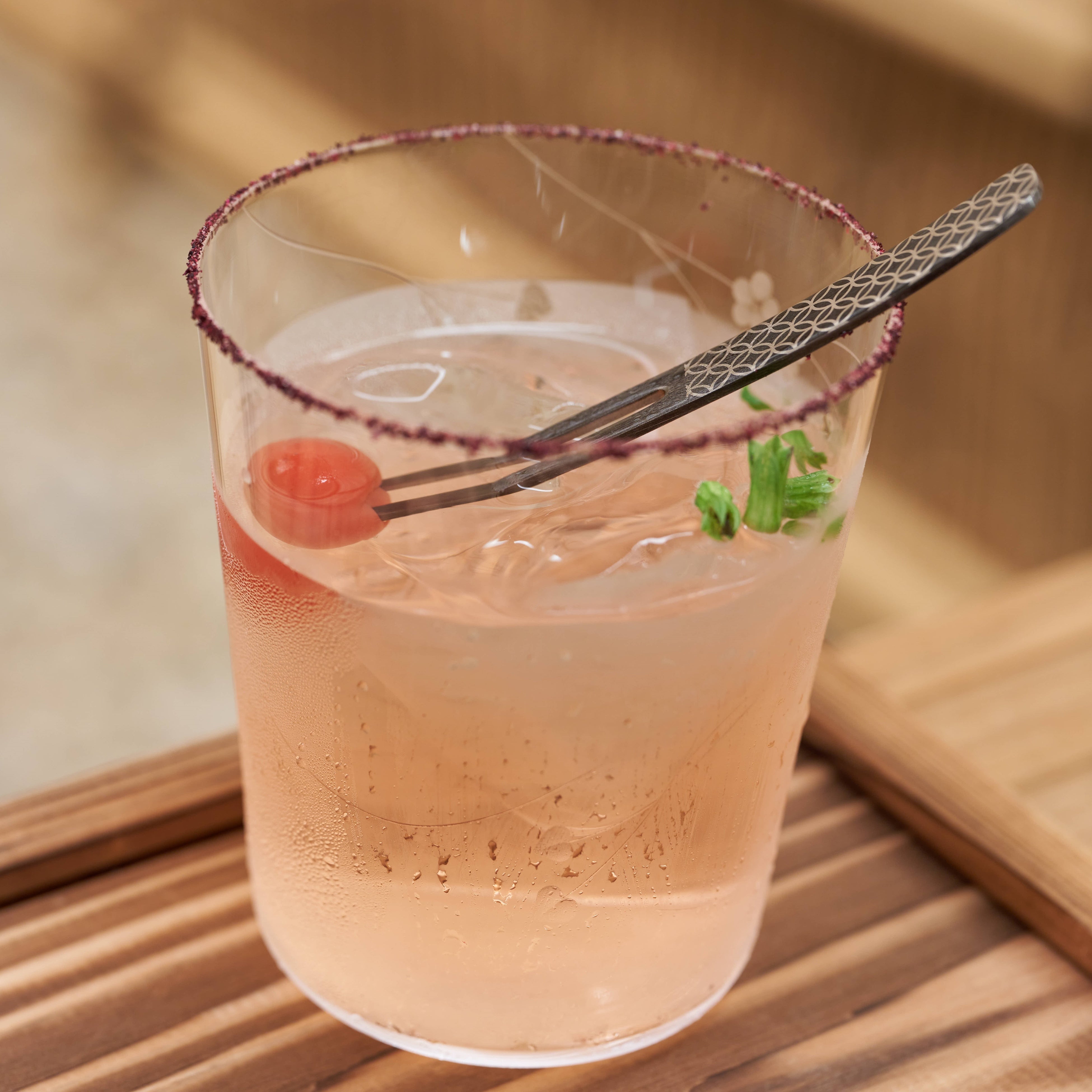 アクセントとしてグラスの縁に赤紫蘇パウダーを付け、小梅を付けたピックをかんざしに見立てて飾りました。
