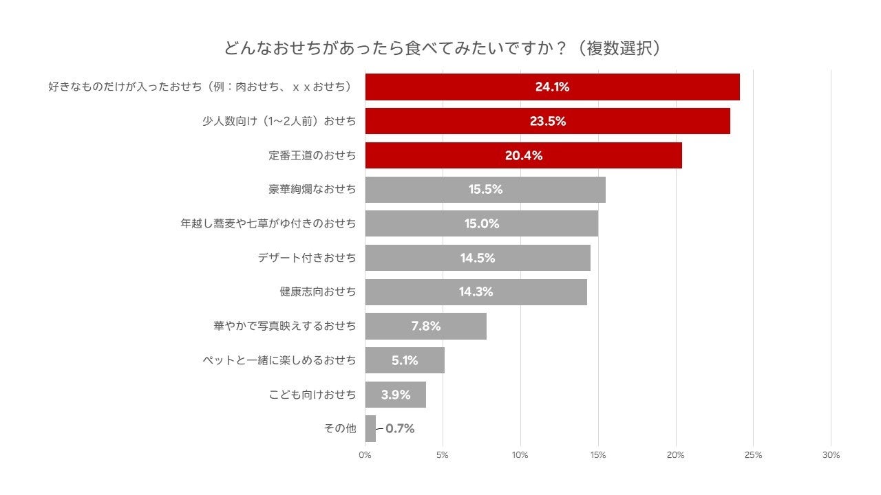 「どんなおせちがあったら食べてみたいか」という質問では、「好きなものだけが入ったおせち」と回答した人が24.1%、「少人数向け(1~2人前)おせち」と回答した人が23.5%と高い割合を占めました。「定番王道おせち」も20.4%と、個々の嗜好やライフスタイルに合わせたおせちへの潜在的なニーズが明らかになりました(図6)。