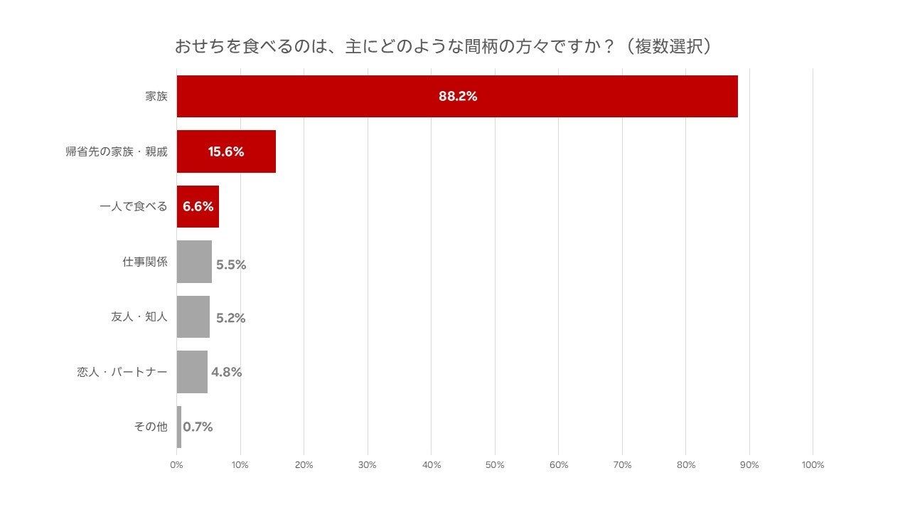 2026年のお正月におせちを食べる人数について聞いたところ、「3~4人」と回答した人が56.1%と過半数を占めました。一方、「2人」と回答した人は22.8%に上り、少人数世帯での喫食ニーズも一定数存在することが示されました(図4)。また、おせちは「家族」と一緒に食べると回答した人が88.2%と、今も年始の家族団らんの中心にあることが分かりました(図5)。