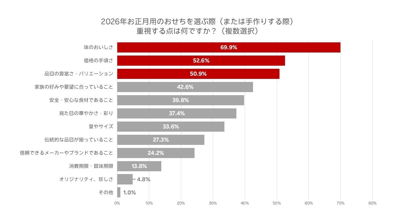 おせちを選ぶ際(または手作りする際)に重視する点のトップ3は、「味のおいしさ」(69.9%)、「価格の手頃さ」(52.6%)、「品目の豊富さ・バリエーション」(50.9%)でした。家族や大切な人と囲むおせちだからこそ、おいしさを最優先する傾向がうかがえます(図3)。