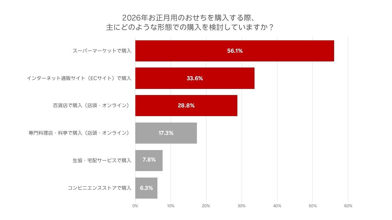 2026年の年始に予定しているおせちの準備方法について尋ねたところ、「一部を手作りし、一部を購入する」と回答した人が57.7%と最も多い結果となりました。次いで「すべて購入する」(39.6%)となり、「すべて手作りする」(10.2%)、「実家や親戚宅で用意されたものを食べる」(7.5%)を大きく上回りました(図1)。おせちの購入先は「スーパーマーケット」(56.1%)が最も多く、次いで「インターネット通販サイト(ECサイト)」(33.6%)、「百貨店」(28.8%)という結果になりました。多くの人が、おせちはすべてを購入に頼るのではなく一部でも手作りしたいと考えていることや、おせちには何かしら手作りの品目を取り入れたいと考えていることがわかりました(図2)。