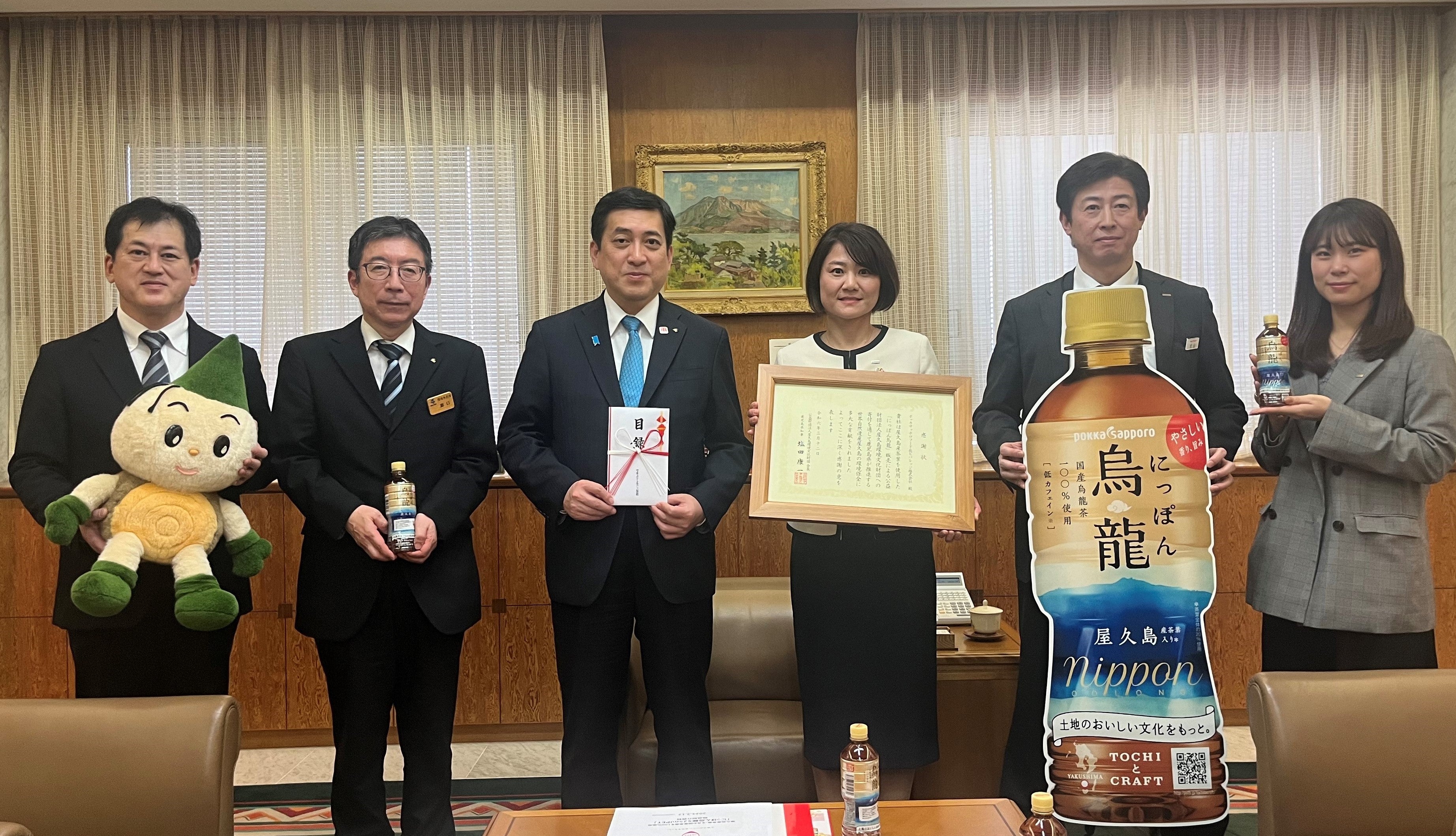 「にっぽん烏龍」は、国産茶葉を100%使用し、そのうち20%は希少な屋久島産茶葉を使用した日本品質の烏龍茶です。旨味やコクがありながらも、苦味・渋みが少なく、丁寧に茶葉を発酵させることで華やかな香りが楽しめます。昨年2月には “世界自然遺産登録30周年”を迎えた屋久島の自然と共生する姿を知っていただきたいという想いから、屋久島環境文化村センターのイメージキャラクター「まるりん」を配すなど、パッケージをリニューアルして発売し、ご好評をいただいています。23年度より、屋久島の自然環境を維持するための活動に役立てていただきたく、商品の売上の一部を「公益財団法人屋久島環境文化財団」へ寄付することとしました。本年初めての寄付を行うにあたり、鹿児島県庁を訪問し、下記の内容を報告しました。