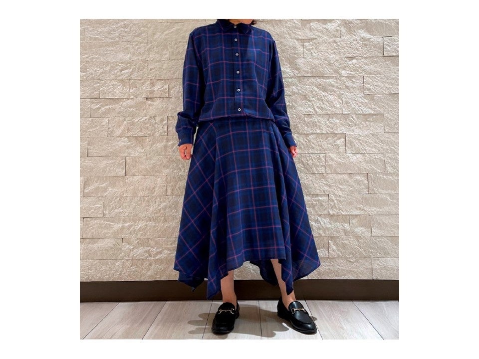 英国調・トラッドを代表する、オリジナルチェックにトライ!ゆったりシルエットのブラウスと、アシンメトリーで動きのあるスカートをセットアップでまとえば、クラシカルなコーディネートに。親しみやすさと上品さの両方が叶います。