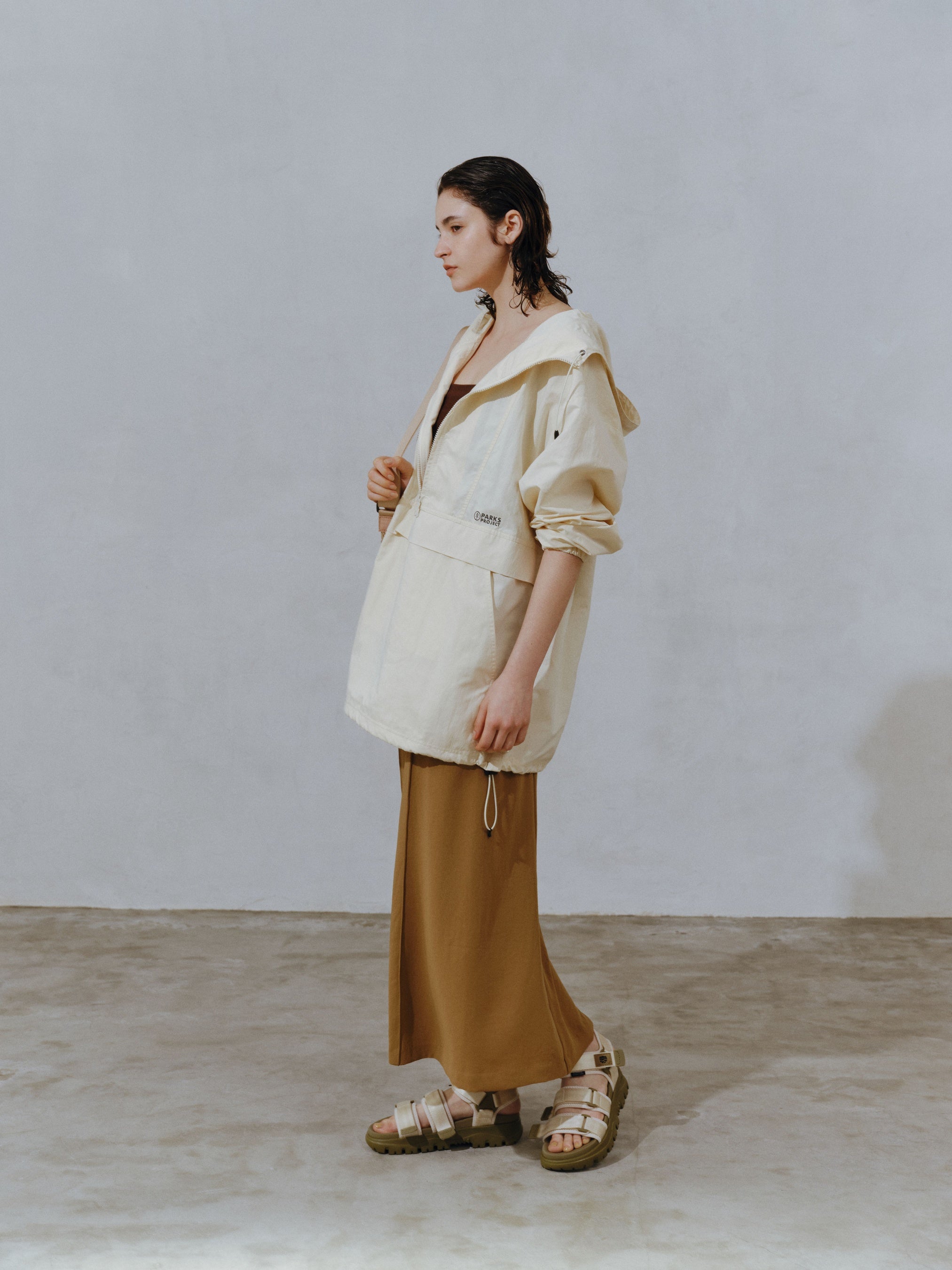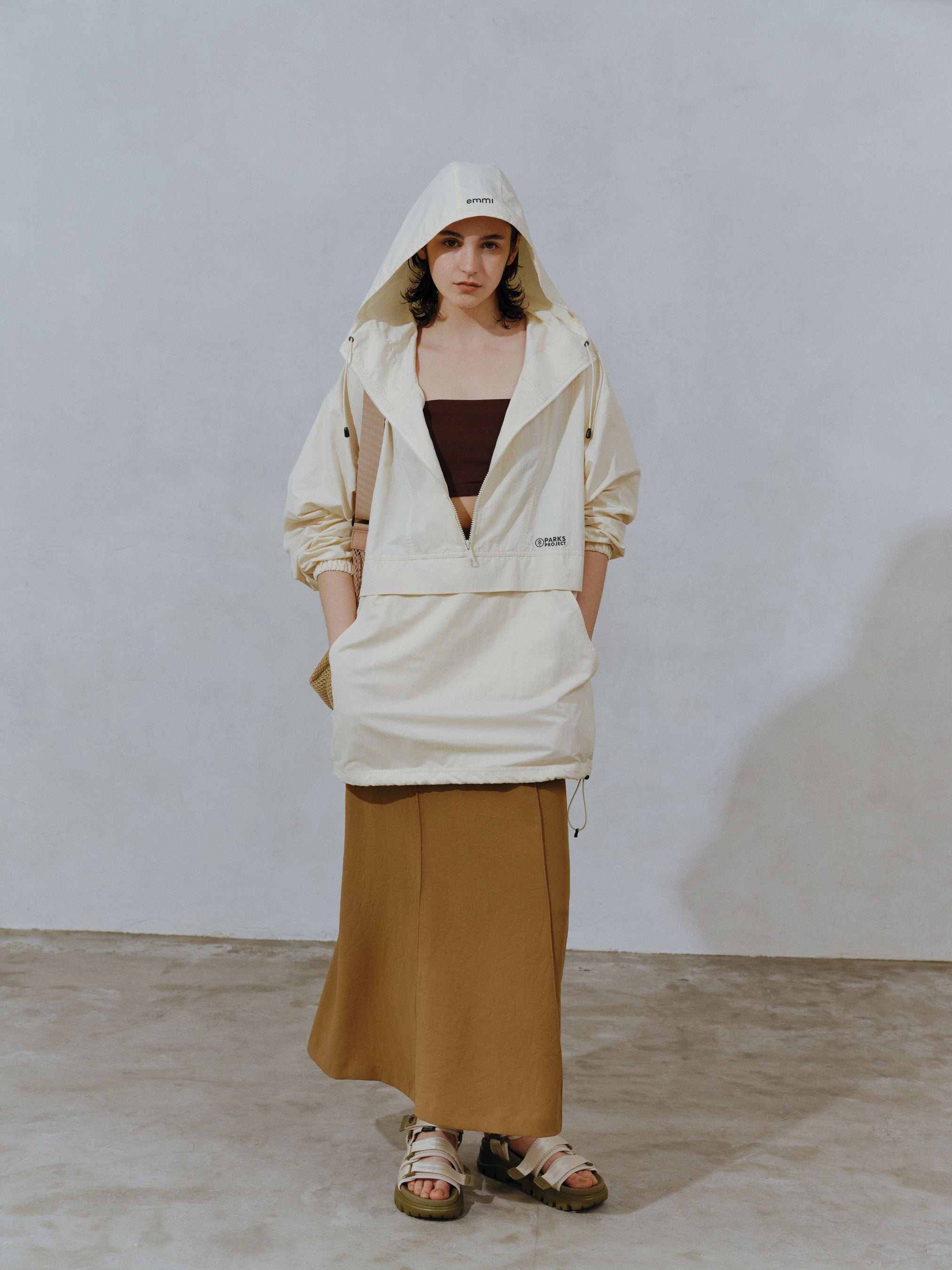 アノラックパーカーは、emmiらしいアイボリーのカラーに微起毛タッチのマイクロリップストップ素材を使用。「軽量+高強度+防風性」を兼ね備えた優れた素材に、デザインのアクセントにもなるフラップポケットをつけることで、アウトドア時の快適さを追求。