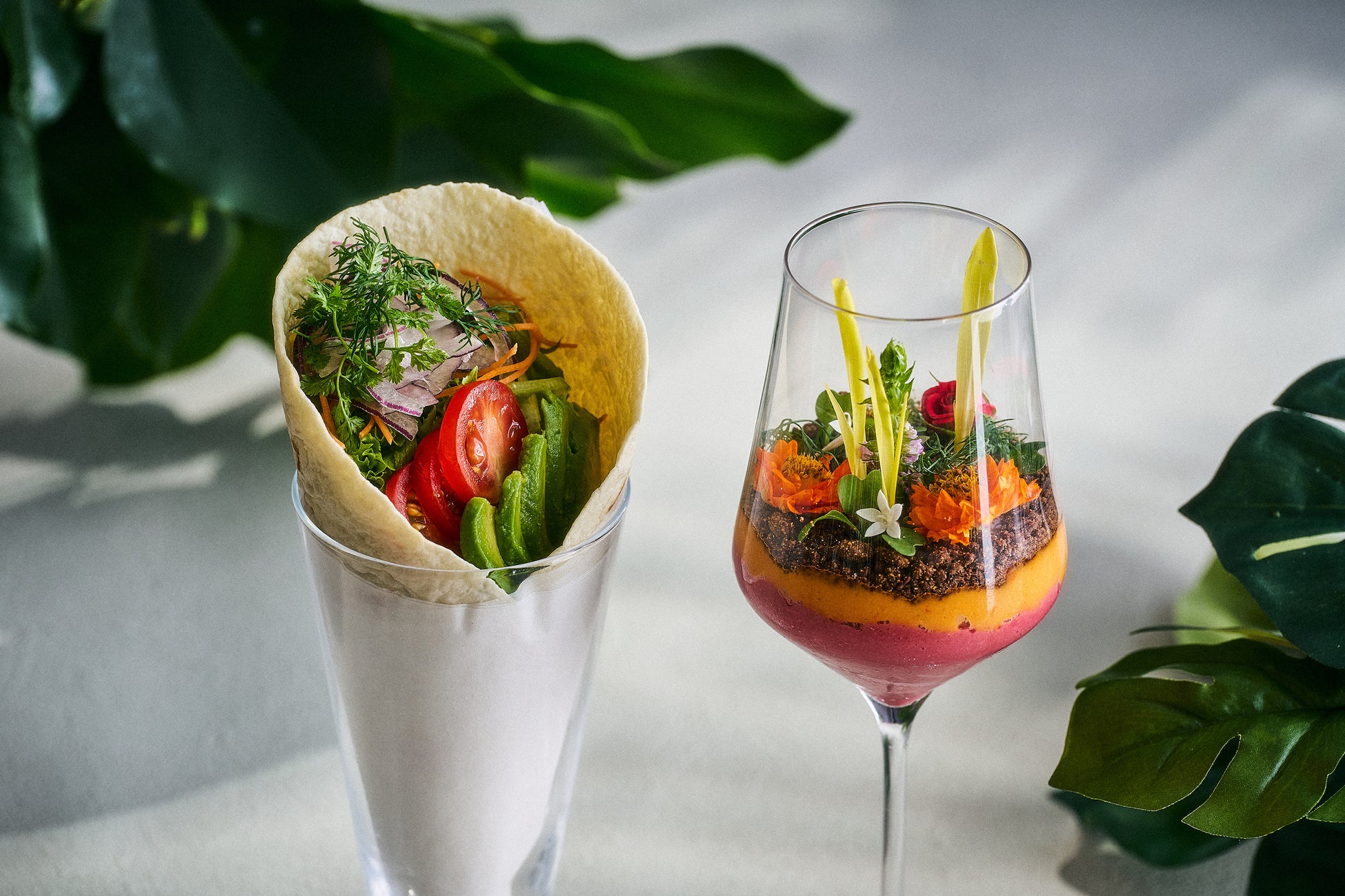野生動物をコンセプトにしたスイーツプレートには、草原の周りにヒョウ柄のオペラや毛並みがリアルなゼブラ柄のココナッツバニラサンドのほか、草むらで過ごす鹿の親子をクッキーとピスタチオケーキで表現したケークピスターシュなどが並びます。プラントベースの食材で作るセイボリーは、キャロブ豆のクランブルで土を表現したヴィーガンフムスと豆乳クリームチーズを使ったスパイシーヴィーガンタコスのいずれかをお選びいただけます。