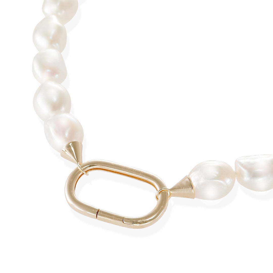 少し縦長でランダムなシェイプがユニークな、テリの美しい上質な淡水パールを使用したネックレス。