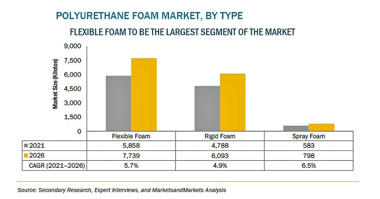 ポリウレタンフォームの市場規模は、2021年の428億米ドルからCAGR7.5%で成長し、2026年には615億米ドルに達すると予測されています。ポリウレタンフォーム市場が成長する主な理由としては、インドやタイなどの新興国で、寝具・家具、電子機器、自動車、建築・建設などのエンドユース産業が成長していることが挙げられます。また、省エネルギーを目的とした建築物の断熱材としてポリウレタンフォームの使用が増加していることや、ポリウレタンフォームのユニークな物理的特性が市場の成長の要因となっています。