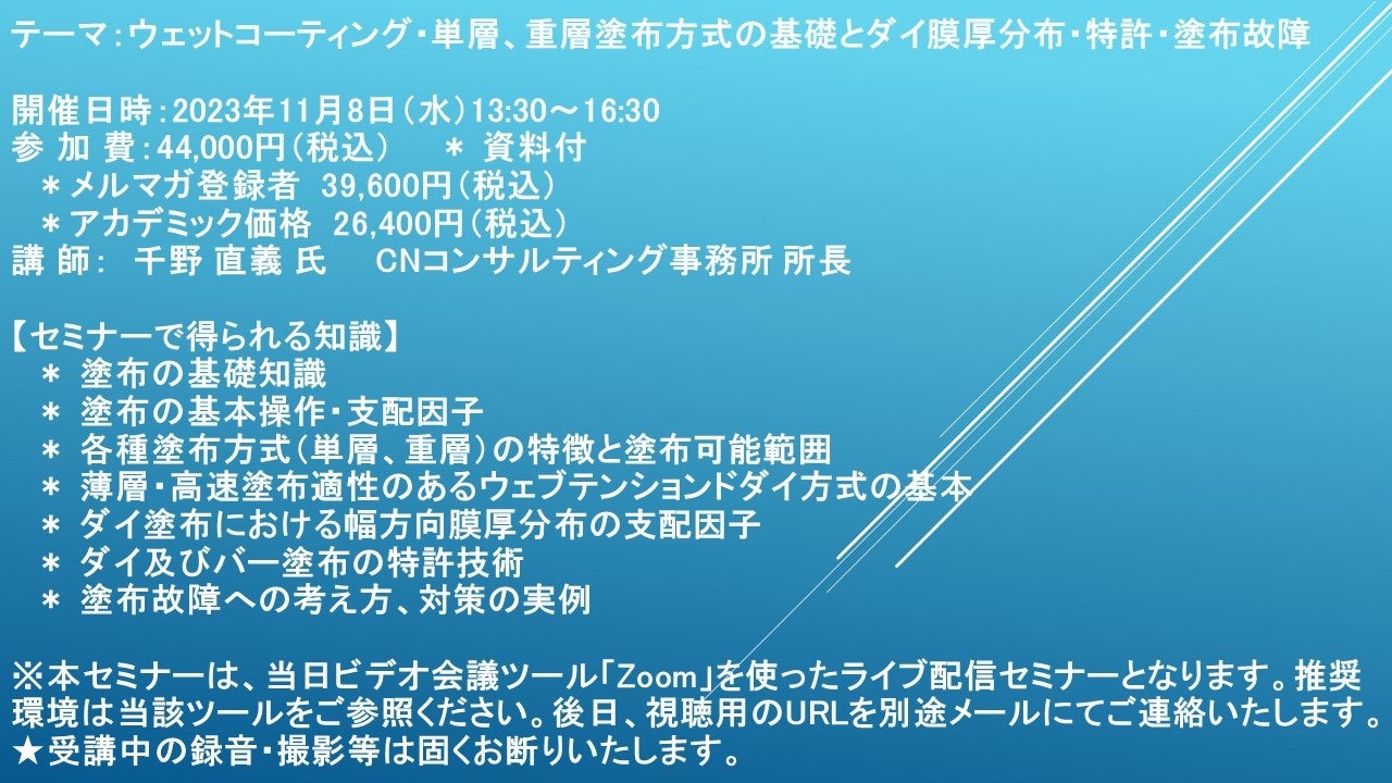 【ライブ配信セミナー】ウェットコーティング・単層、重層塗布方式の基礎とダイ膜厚分布・特許・塗布故障 11月8日(水)開催 主催:(株)シーエムシー・リサーチ