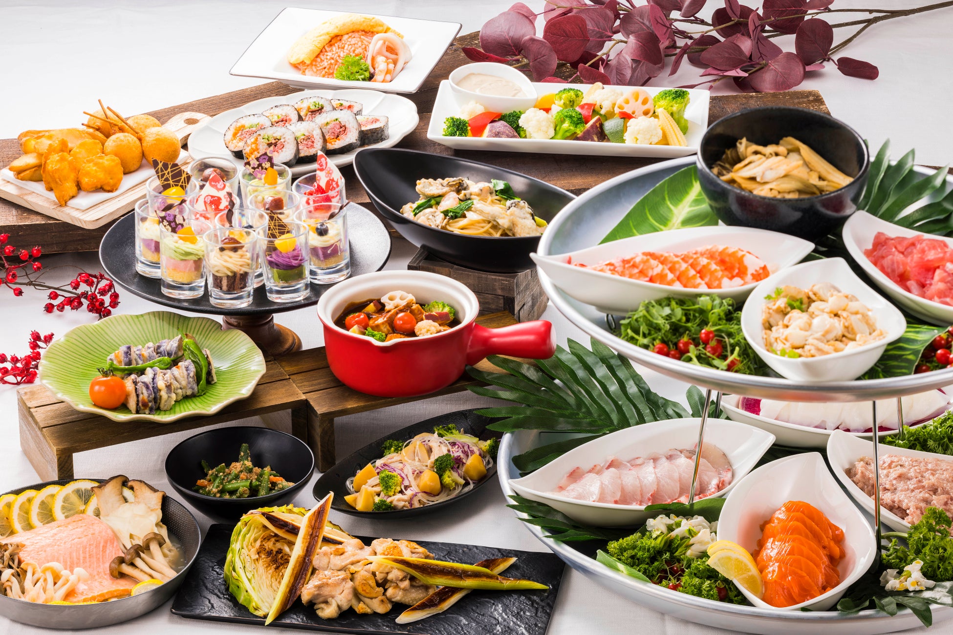 鶏ハラミの鉄板焼き / シーフードオムライス / 牛肉の赤ワイン煮 /牡蠣とほうれん草 牡蠣醤油のペペロンチーノ / 茄子挟み揚げ / 温野菜 かにみそバーニャソース / 秋鮭と茸のレモン蒸し / 尾道ラーメン / バターチキンカレー / 海鮮丼タワー(サーモン・海老・ネギトロ・鯛・カンパチ・烏賊など) / 蒸し鶏と栗 春雨サラダ / 牛肉カルビ巻き キンパ風 / サラダバー / フルーツ各種 / デザート各種 / ジェラート各種 / キッズコーナー(チキンナゲット / チーズドッグ / フライドポテト) など
