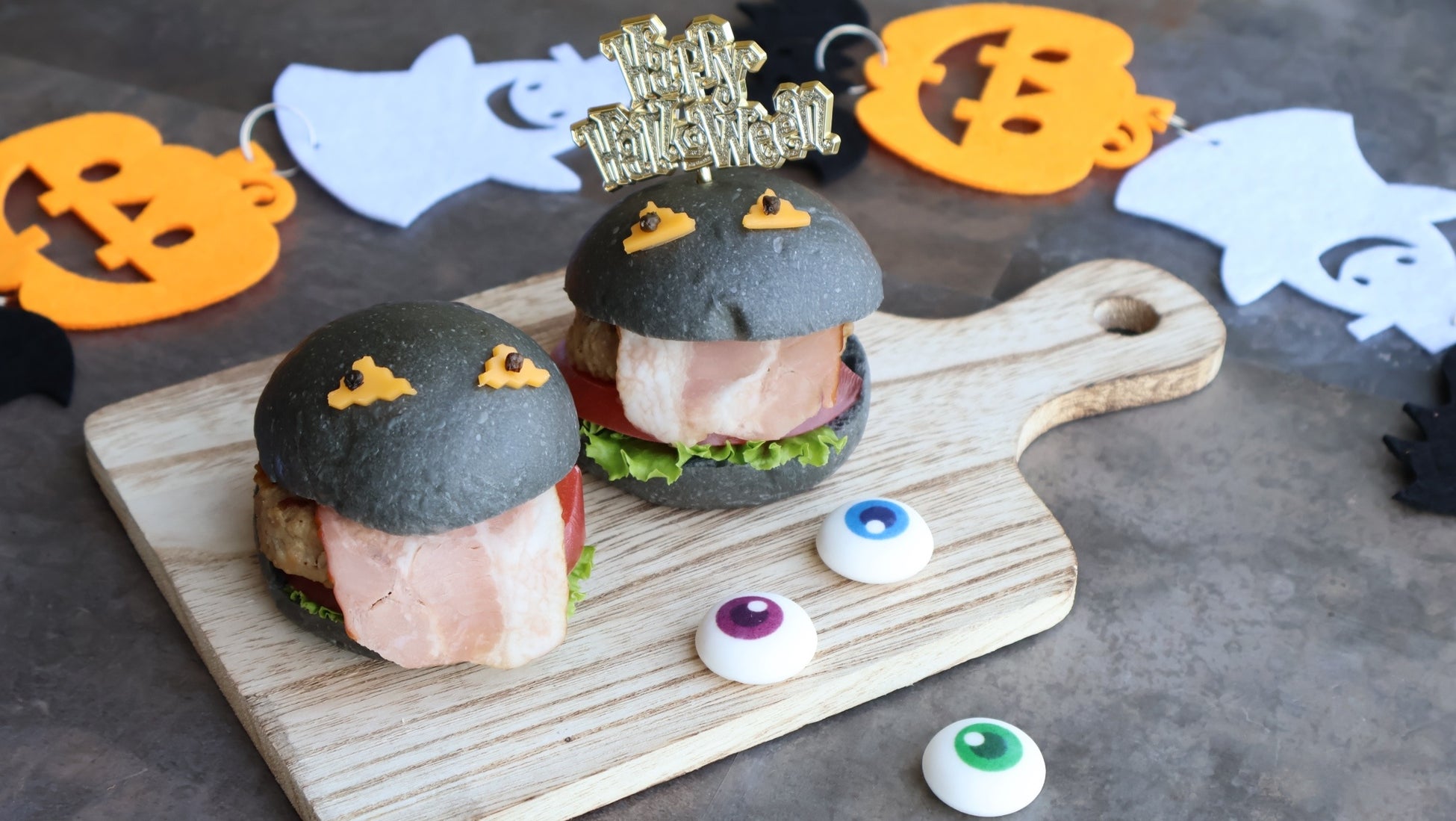 ハロウィーン(10月31日)に向けて、オリジナルおばけバーガーを作るプログラム。広島県竹原市で作られた竹炭入りのパンを使い地産地消について考えます。