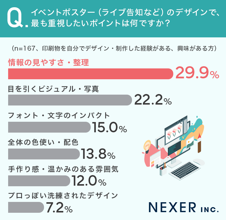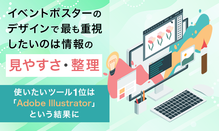 イベントポスターのデザインで最も重視したいのは「情報の見やすさ・整理」。使いたいツール1位は「Adobe Illustrator」という結果に