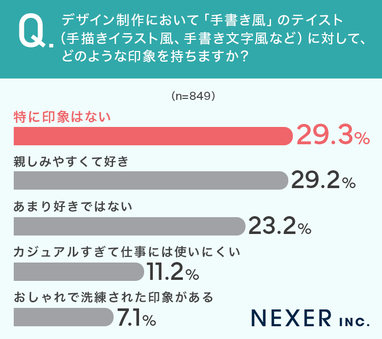■「手書き風」テイストは「特に印象はない」が29.3%で最多、「親しみやすくて好き」が29.2%で僅差に