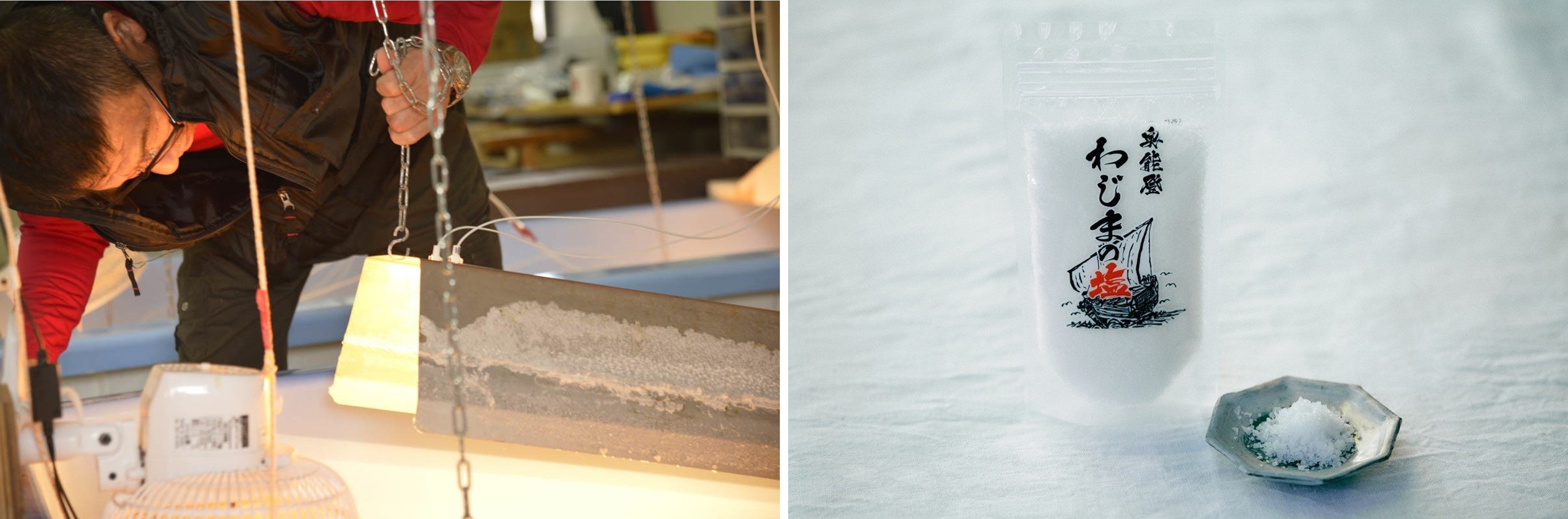 ・石川県輪島の海水を100%利用し、清潔な室内で、海水の上からランプの熱を当て、体温と同程度の低温で約10日かけて、ゆっくり緩やかに結晶化させています。