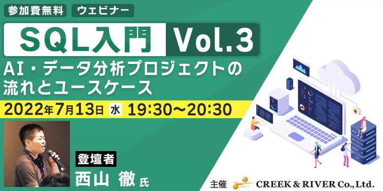 株式会社クリーク・アンド・リバー社(C&R社)は7月13日(水)、デジタルマーケティング(デジマ)やデータ分析にご興味をお持ちの方々を対象に、無料オンラインセミナー「SQL入門 Vol.3 ~AI・データ分析プロジェクトの流れとユースケース~」を開催いたします。