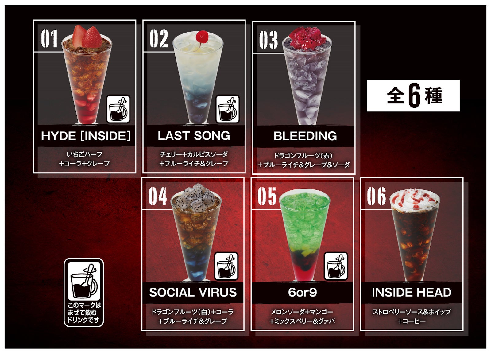 コラボドリンクは、10月16日(水)にCDリリースされた最新アルバム「HYDE [INSIDE]」より、アルバムタイトルを冠した「HYDE [INSIDE]」と、収録曲「LAST SONG」「BLEEDING」「SOCIAL VIRUS」「6or9」「INSIDE HEAD」の各楽曲をイメージした全6種【各750円(税込)】をご用意します。さらに、コラボフード「6or9~スナック~(オリジナルランチョンマット付)【860円(税込)】」「6or9~ピザ~(オリジナルランチョンマット付)【2,900円(税込)】」もご用意!注文特典として、コラボドリンク・コラボフード1品ご注文につき、オリジナルコースター全10種の中からランダムでプレゼントします。(各ドリンク、フードによってプレゼント枚数が異なります)コラボフード「6or9~スナック~」「6or9~ピザ~」には、「HYDE [INSIDE] LIVE 2024」のツアートラックのデザインを再現したランチョンマット(A4)【全2種:第1弾1種/第2弾1種】もついてきます。