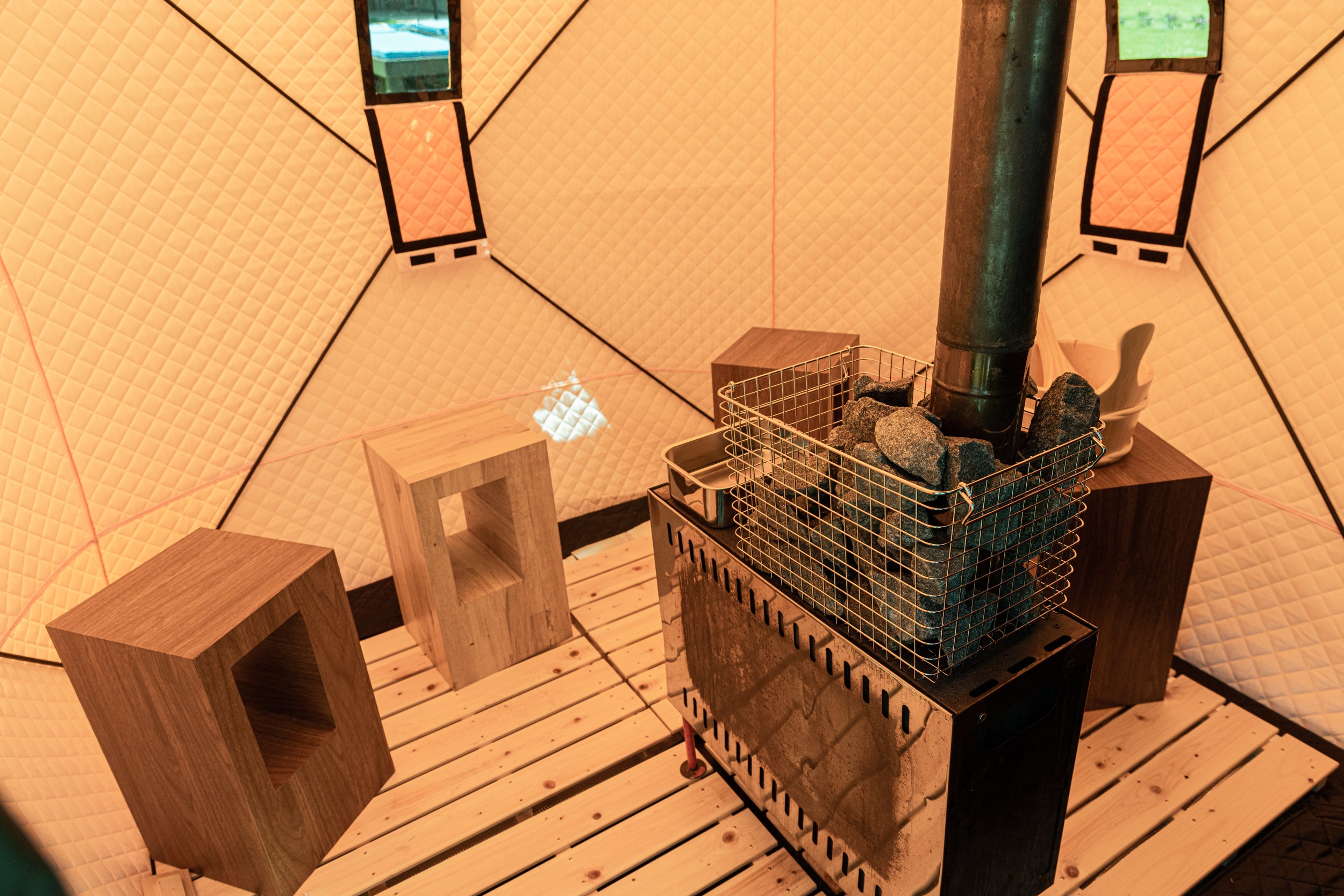 テント型サウナではありますが、中の温度はしっかりと上がります。4名用の小型テントが80~90度前後、8名用の大型テントは最大105度まで上がります。さらにテント型サウナ内では、ロウリュやアウフグースも体験いただけます。