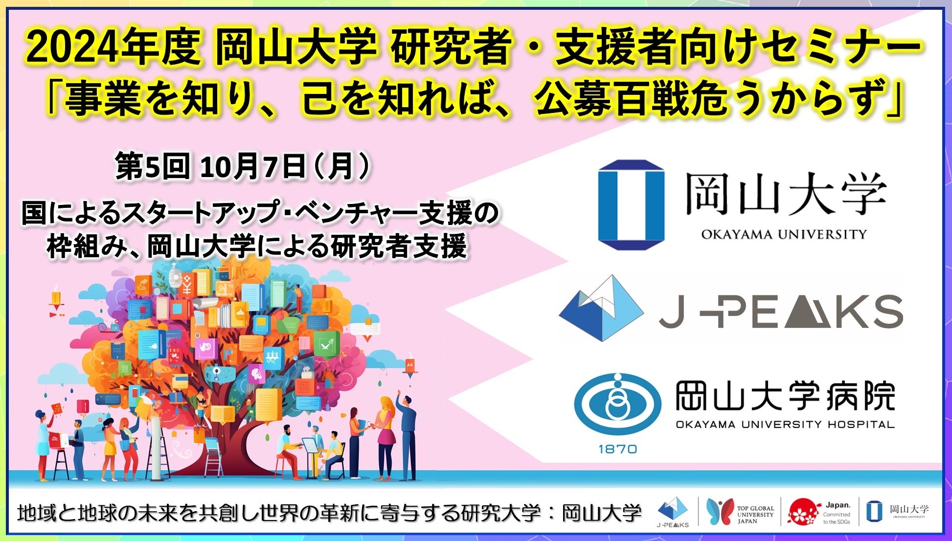 岡山大学研究者・支援者向けセミナー「事業を知り、己を知れば、公募百戦危うからず」第5回 国によるスタートアップ・ベンチャー支援の枠組み、岡山大学による研究者支援〔10/7,月 ハイブリッド〕